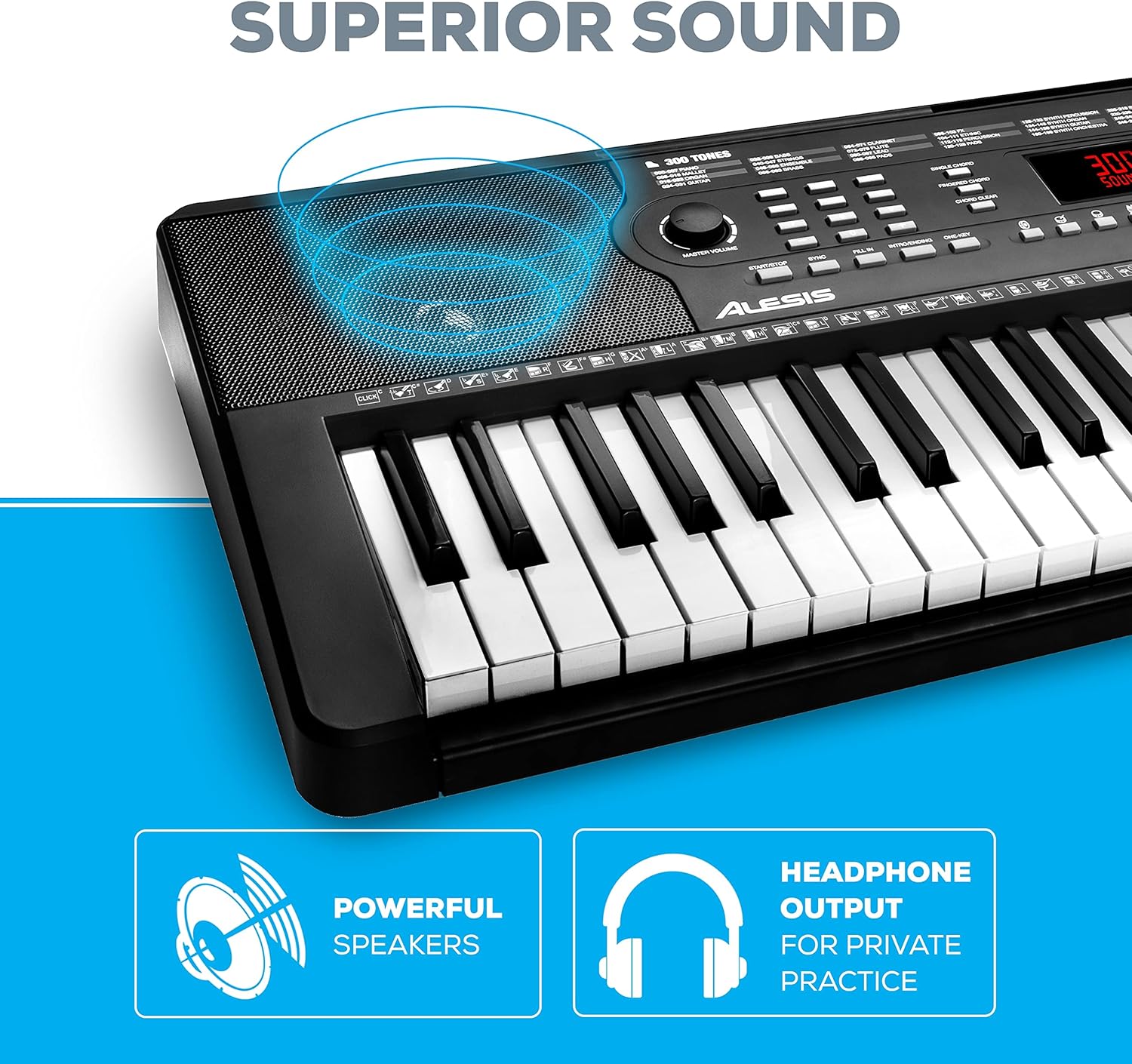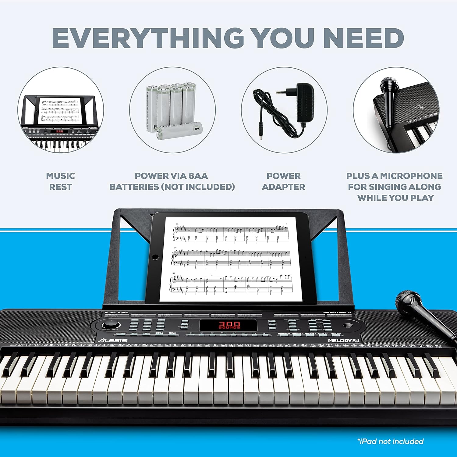 * Keys: 54 piano-style keys * Sounds: 300 built-in tones * Rhythms: 300 built-in accompaniment rhythms * Songs: 40 demo songs * Speakers: Built-in * Connectivity: Headphone input, microphone input * Power: Power adapter or 6 AA batteries (not included) * Includes: Music rest, microphoneWe partner with Amazon and other retailers to provide accurate product information and convenient access to purchase options. As an Amazon Associate we earn from qualifying purchases.