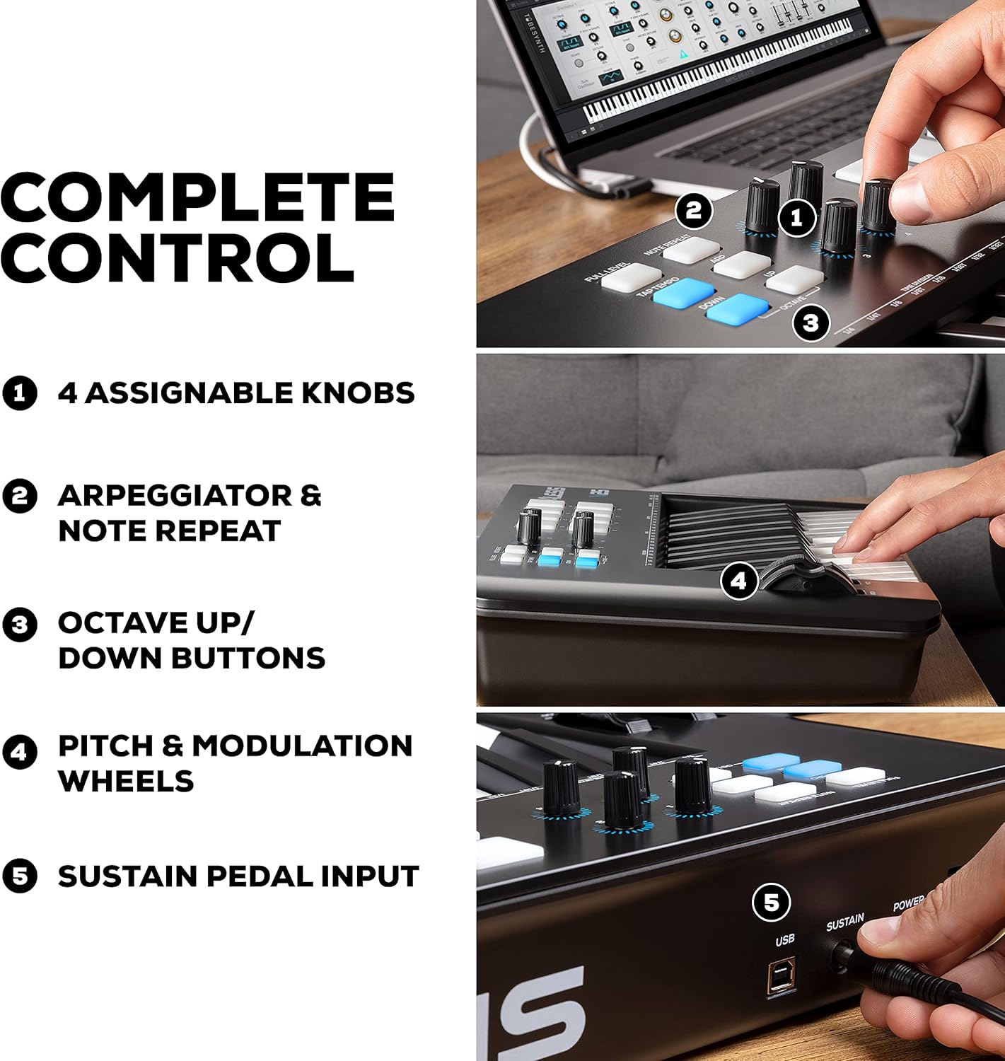 - Keys: 25 Full-Size, Velocity Sensitive, Synth Action Keys