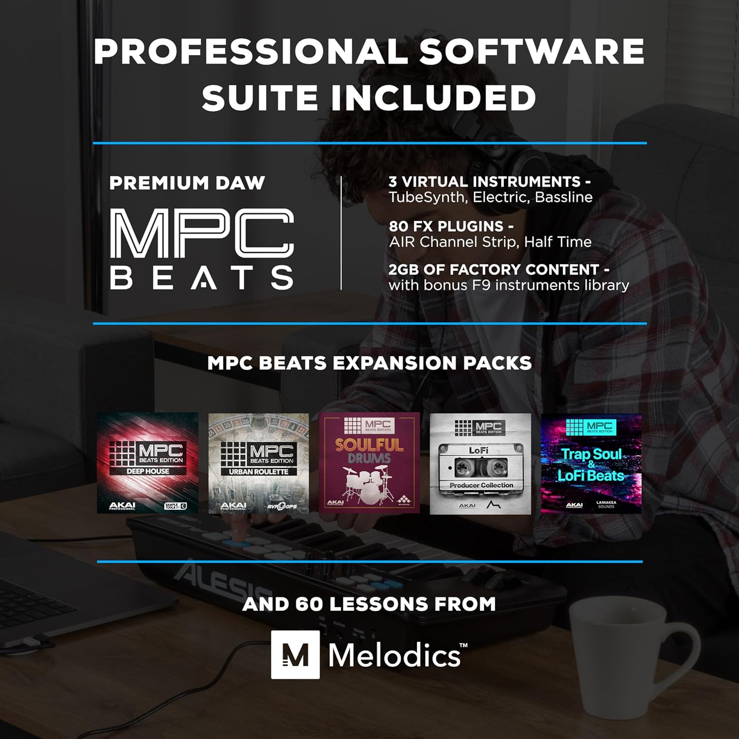 - Software Included: MPC Beats Software Suite, Melodics (60 Piano Lessons), Easy Point-and-Click MIDI Editor Software