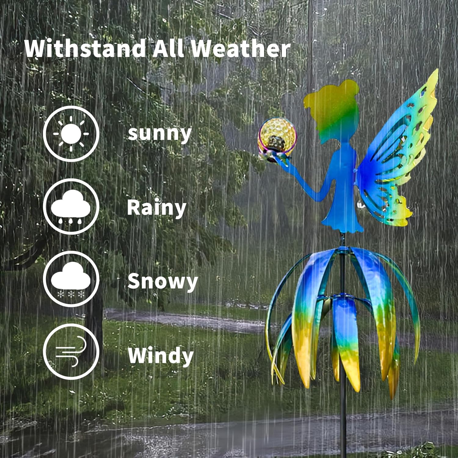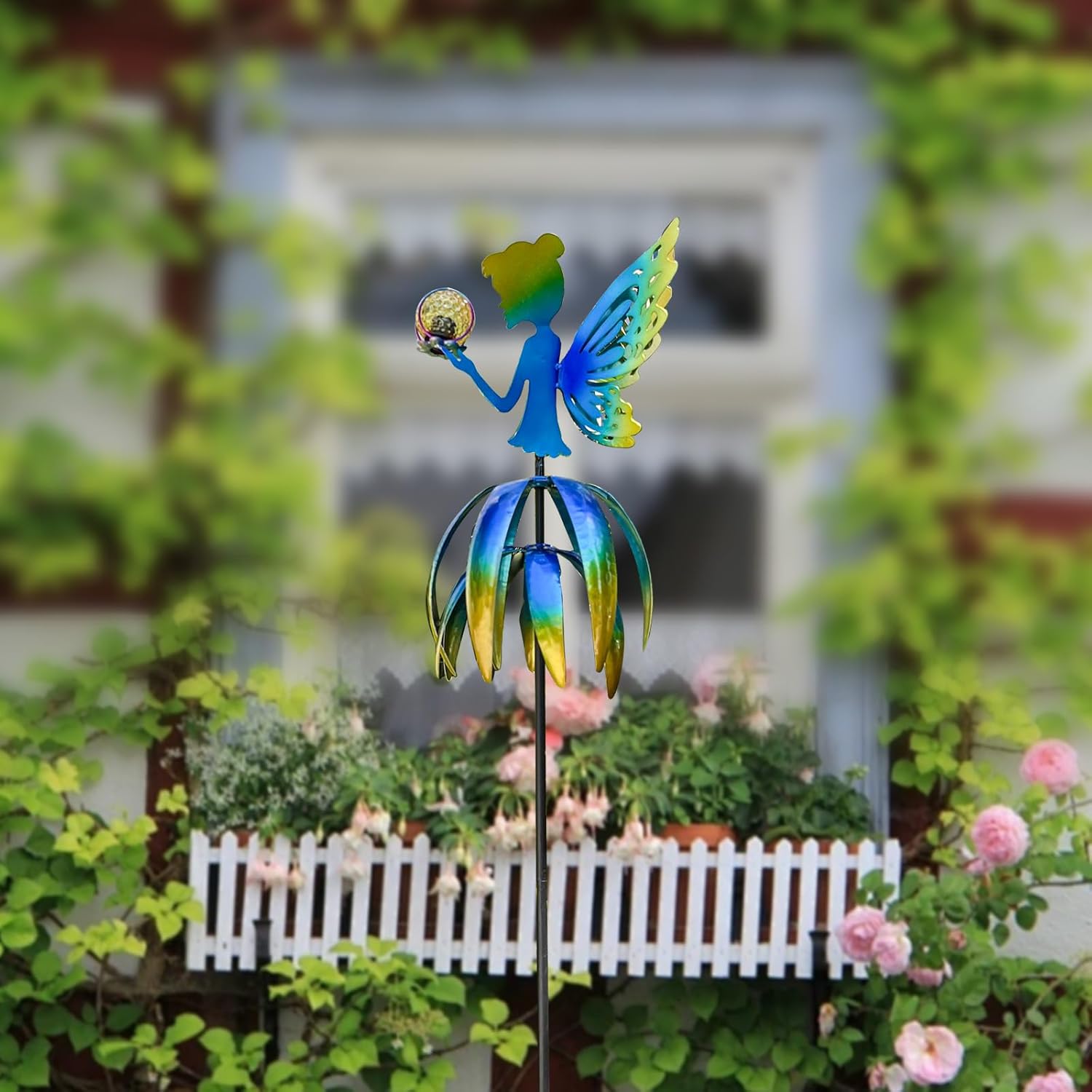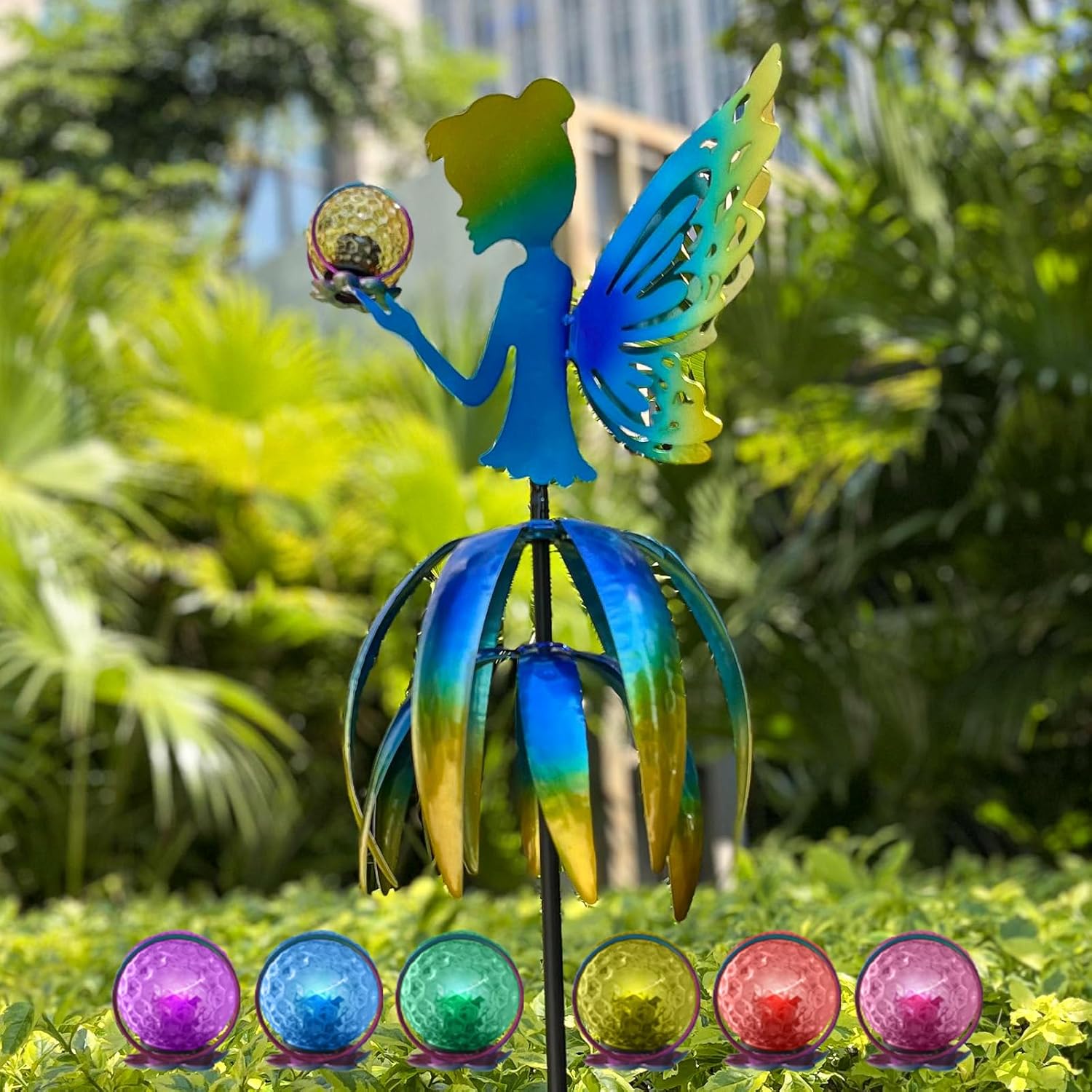 The 55'' Large Outdoor Metal Wind Spinner features a charming fairy design and multi-color solar LED ball, perfect for adding a touch of magic to your garden or patio.
