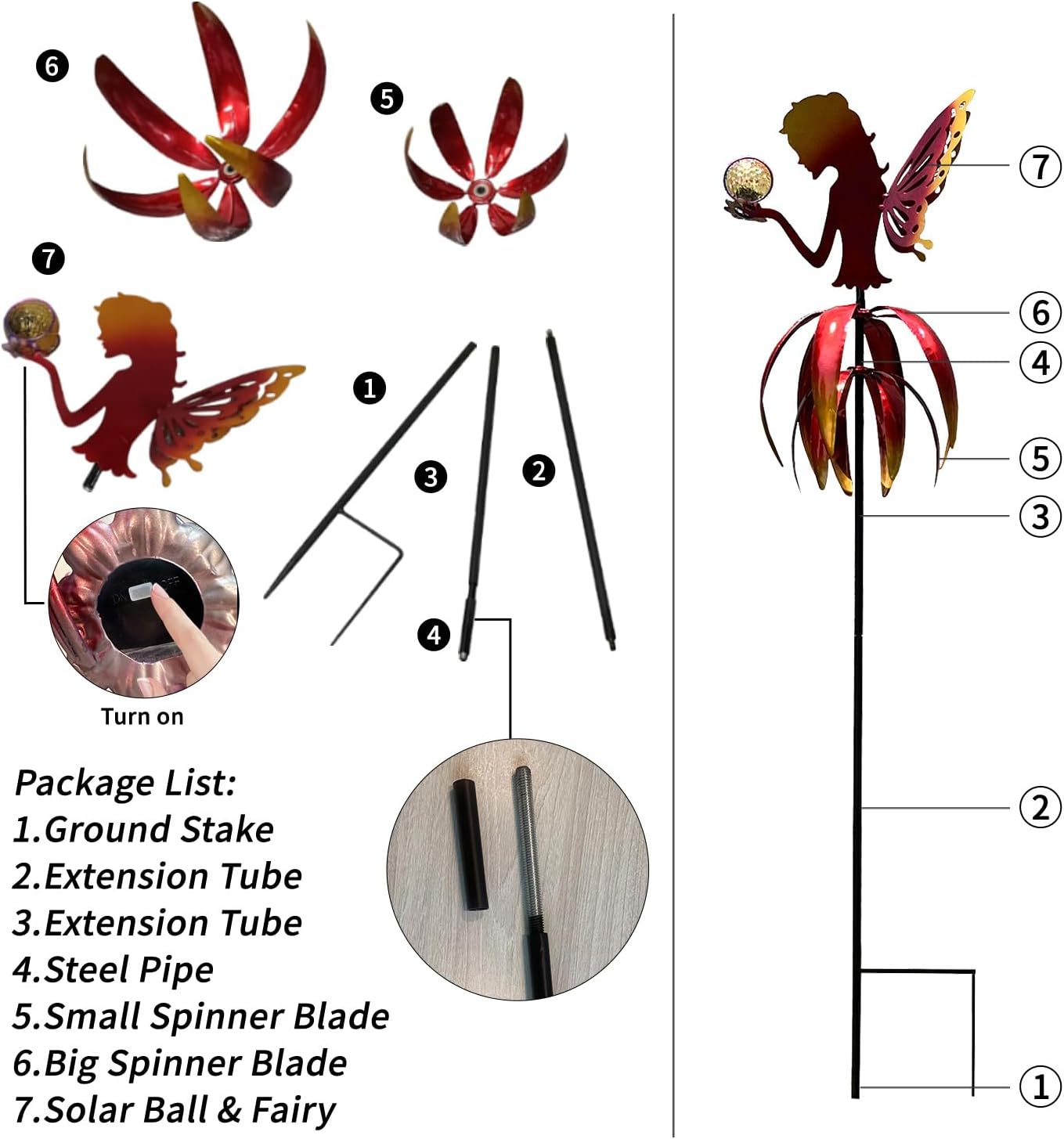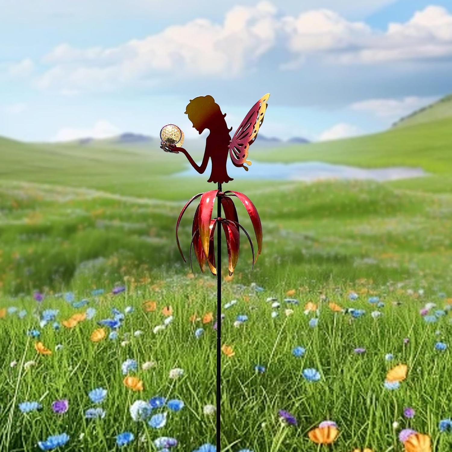 The 55" Large Outdoor Metal Wind Spinner combines artistic design with functional lighting. This spinner features a fairy design, multi-color solar LED ball, and two layers of skirt with 360-degree rotation, adding a touch of magic to your patio, park, or garden.