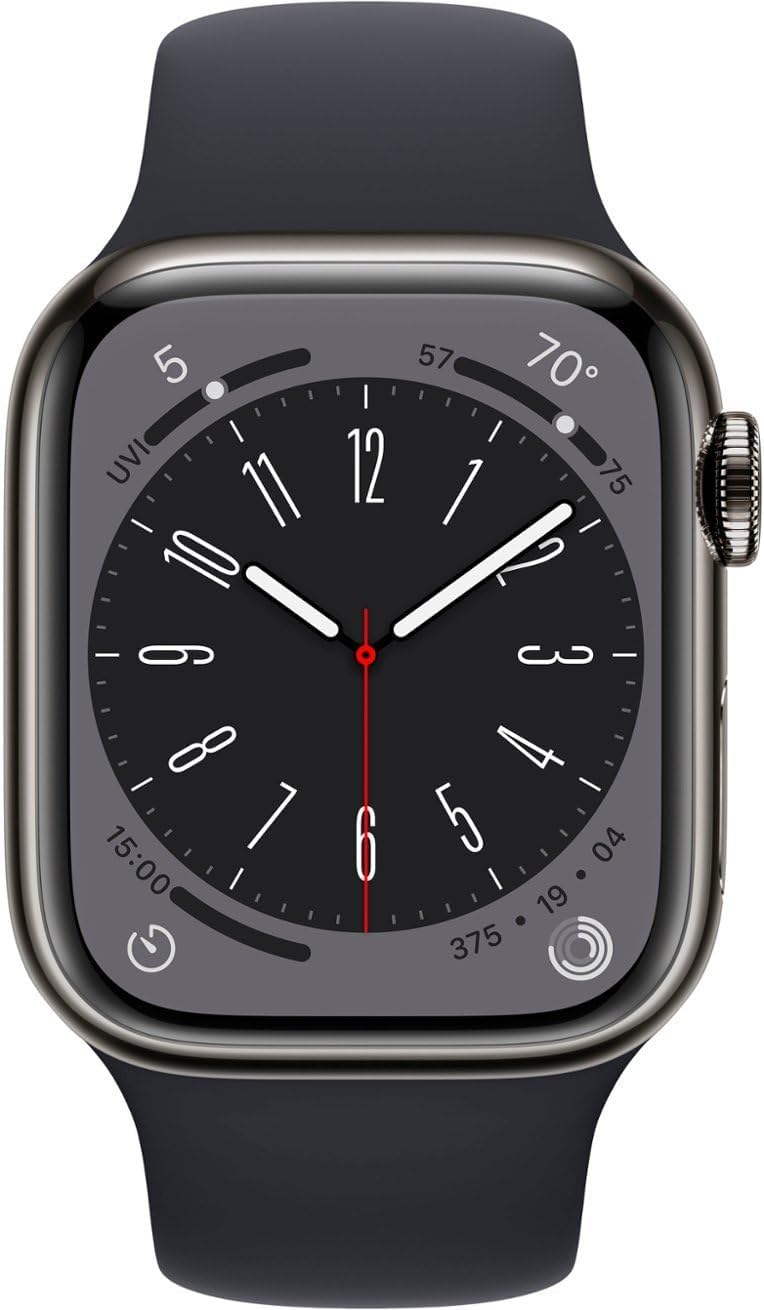 Experience the perfect blend of elegance and functionality with the Apple Watch Series 8. This renewed 41mm GPS + Cellular model, featuring a graphite stainless steel case and midnight sport band, keeps you connected while offering advanced health and fitness tracking.
