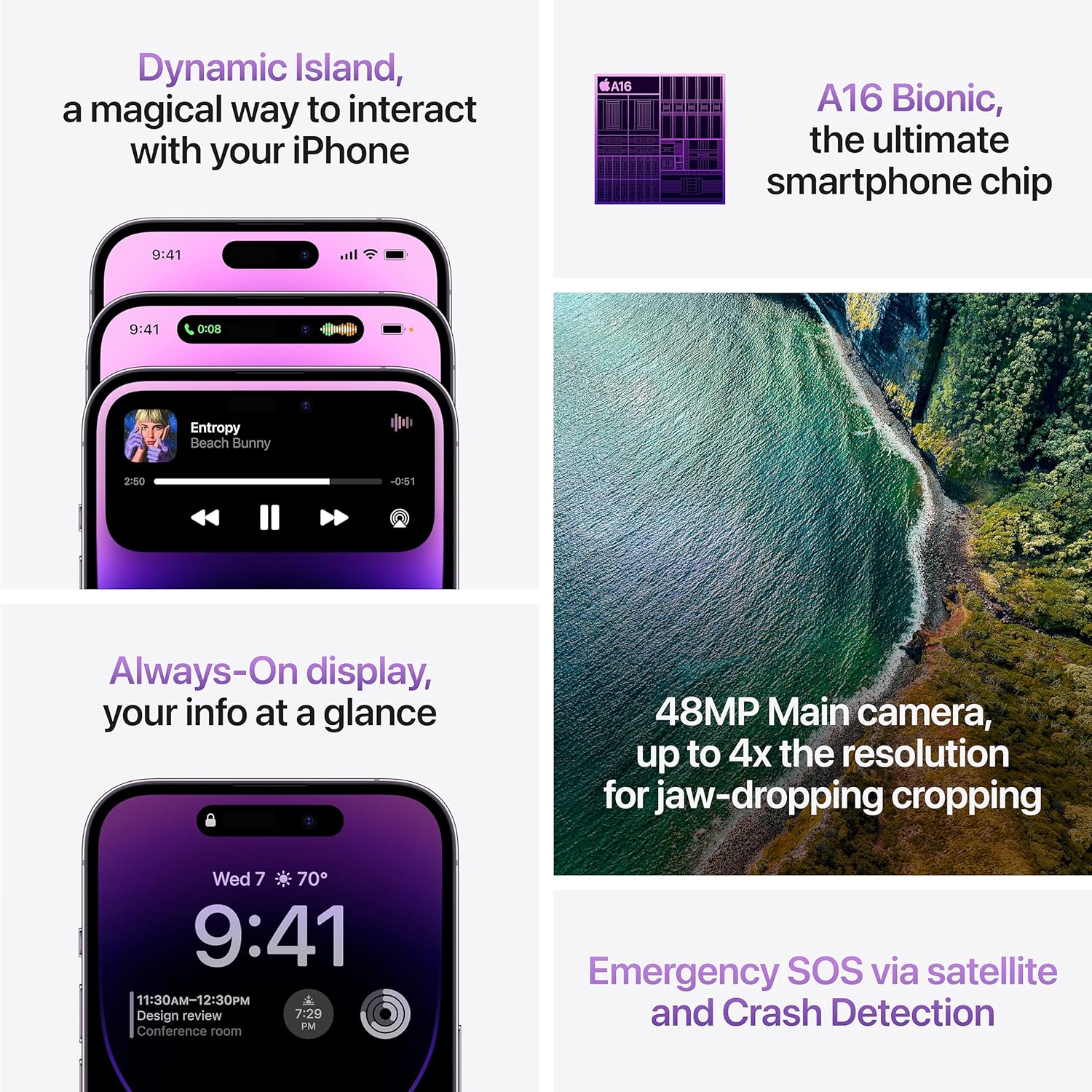 The Apple iPhone 14 Pro combines cutting-edge technology with a sleek design. Featuring a stunning Super Retina XDR display, advanced camera capabilities, and the powerful A16 Bionic chip, this renewed device offers a premium smartphone experience.
