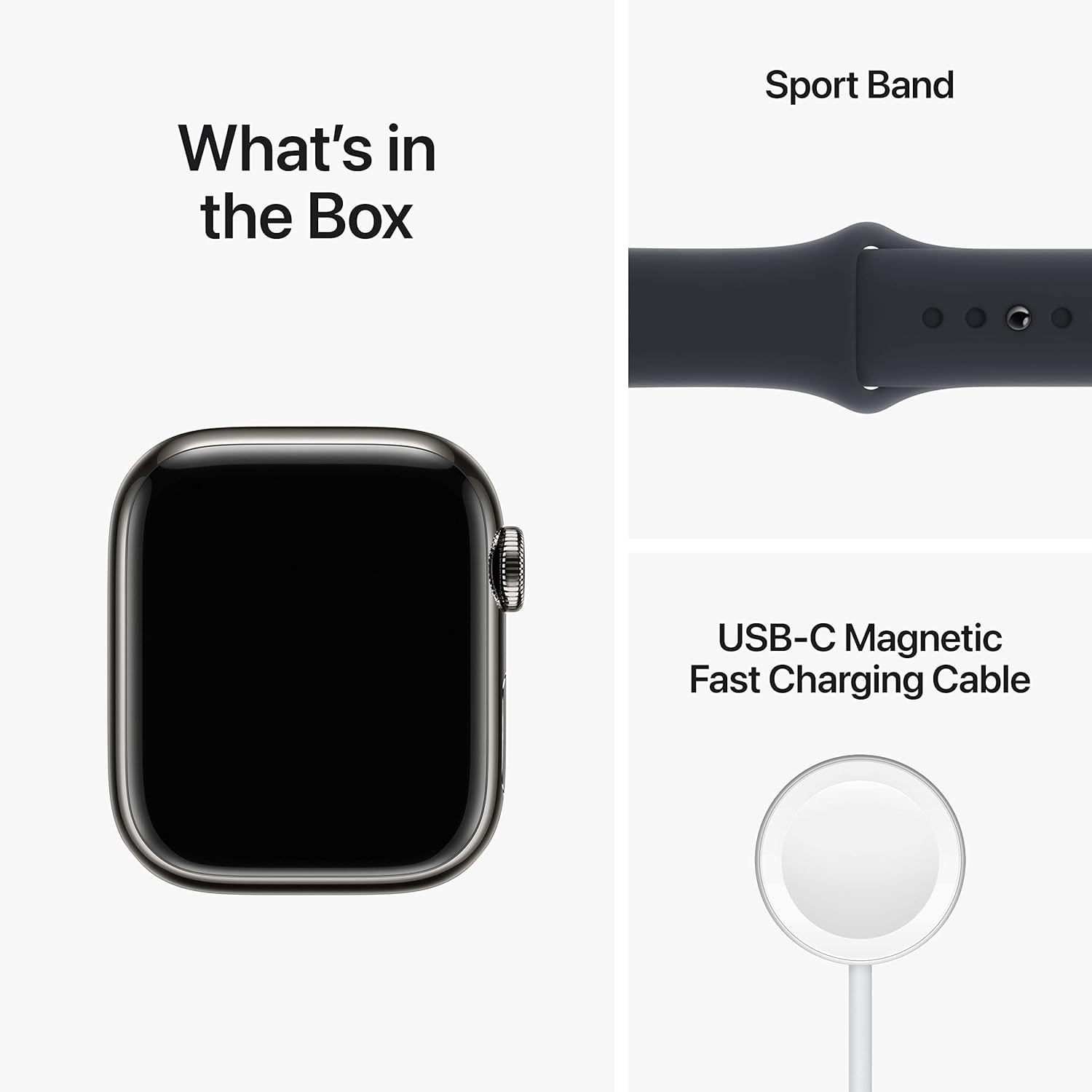 The Apple Watch Series 8 (GPS + Cellular) offers advanced health and safety features in a sleek design. This renewed 41mm model comes with a Graphite Stainless Steel case and Midnight Sport Band, providing seamless connectivity and essential insights into your well-being.