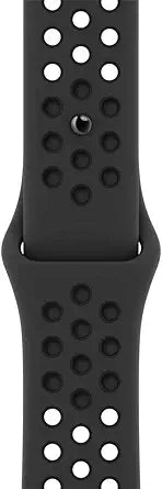 The Apple 41mm Anthracite/Black Nike Sport Band is crafted from a custom high-performance fluoroelastomer, offering durability, strength, and surprising softness. Designed with compression-molded perforations for breathability, it ensures a comfortable fit during workouts and everyday activities.