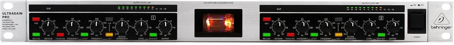The Behringer MIC2200 V2 is a 2-channel tube microphone preamplifier designed to add warmth and clarity to your recordings. With its highpass filter and fully parametric EQ, it provides versatile tone-shaping options for professional audio production.