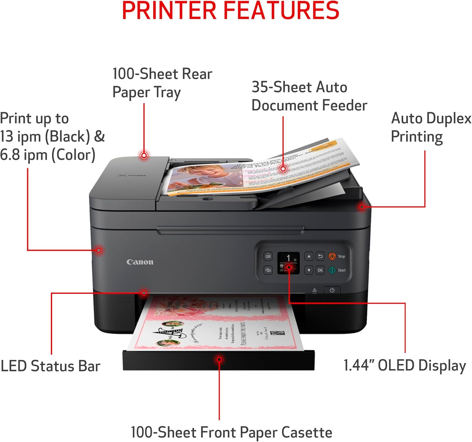 The Canon PIXMA TR7020a All-in-One Wireless Color Inkjet Printer offers comprehensive functionality in a compact design. From printing documents and photos to copying and scanning, this printer streamlines your workflow with ease. **Specifications:** * **Functions:** Print, Copy, Scan * **Connectivity:** Hi-Speed USB, Wireless PictBridge, Wi-Fi, Bluetooth 4.0 LE * **Display:** 1.44" OLED * **Duplex Printing:** Automatic * **Auto Document Feeder (ADF):** 35-Sheet * **Print Resolution:** Up to 4800 x 1200 dpi * **Print Speed (4" x 6" Photo):** Approx. 43 seconds * **Print Speed (Color):** 6.8 ipm * **Copy Speed (Color):** 6 ipm * **Max Copies:** Up to 99 * **Scan Resolution:** 1200 x 2400 dpi (Optical) * **Color Depth:** 8-bit * **Paper Capacity (Rear):** 100 Sheets Plain Paper or 20 Sheets 4 x 6 / 10 Sheets 5 x 7 Photo Paper * **Paper Capacity (Front Cassette):** 100 Sheets Plain Paper * **Dimensions:** 8.2" H x 14.4" W x 15.9" D * **Weight:** 18.1 lbsWe partner with Amazon and other retailers to provide accurate product information and convenient access to purchase options. As an Amazon Associate we earn from qualifying purchases.