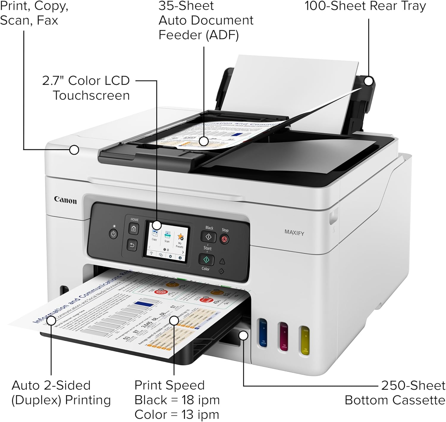 The Canon MegaTank GX4020 is an all-in-one wireless supertank printer designed for small offices, offering printing, copying, scanning, and fax capabilities. With its high-yield ink system and auto document feeder, this printer delivers cost-effective and efficient performance. **Specifications:** * **Brand:** Canon * **Model:** 5779C002 * **Functions:** Print, Copy, Scan, Fax * **Printing Technology:** Inkjet * **Connectivity:** Wired, Wireless * **Maximum Print Resolution (Black and White):** 2400 dpi * **Maximum Print Speed (Monochrome):** 18 ppm * **Maximum Print Speed (Color):** 13 ppm * **Display:** 2.7” LCD Color Touchscreen * **Paper Size Support:** 4” x 6”, 5” x 5”, 5” x 7”, 7” x 10”, 8” x 10”, 8.5” x 11”, 8.5” x 14” * **Dual-Sided Printing:** Auto * **Auto Document Feeder:** 50-sheet Semi-Auto * **Hardware Interface:** USB 2.0 * **Dimensions:** 15.8"D x 28.4"W x 12"H * **Item Weight:** 20.9 poundsWe partner with Amazon and other retailers to provide accurate product information and convenient access to purchase options. As an Amazon Associate we earn from qualifying purchases.
