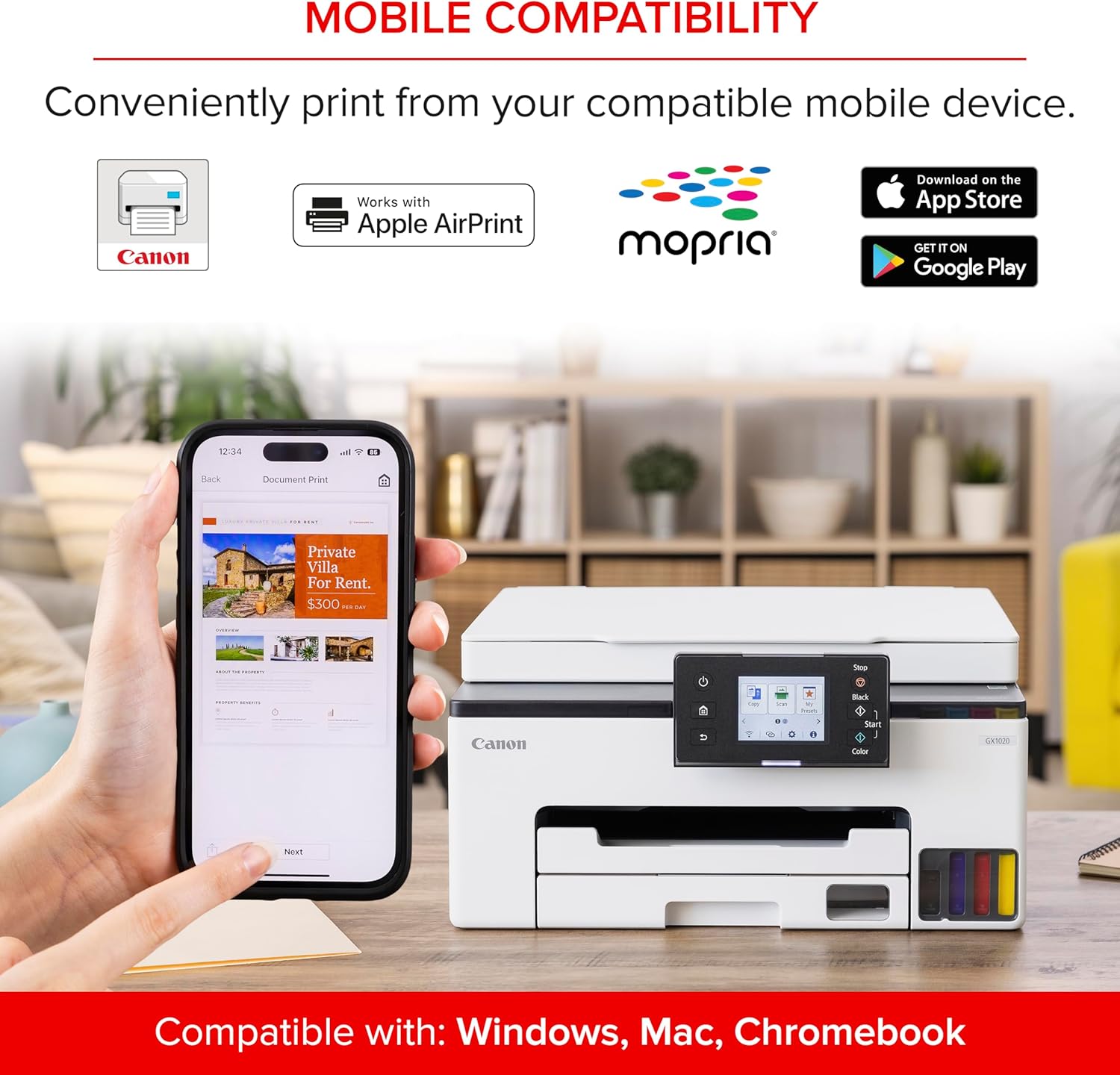 The Canon MegaTank GX1020 All-in-One Printer offers high-quality, low-cost printing for both home and office environments. With its MegaTank ink system, wireless connectivity, and versatile features, this printer is designed to enhance productivity and provide peace of mind.