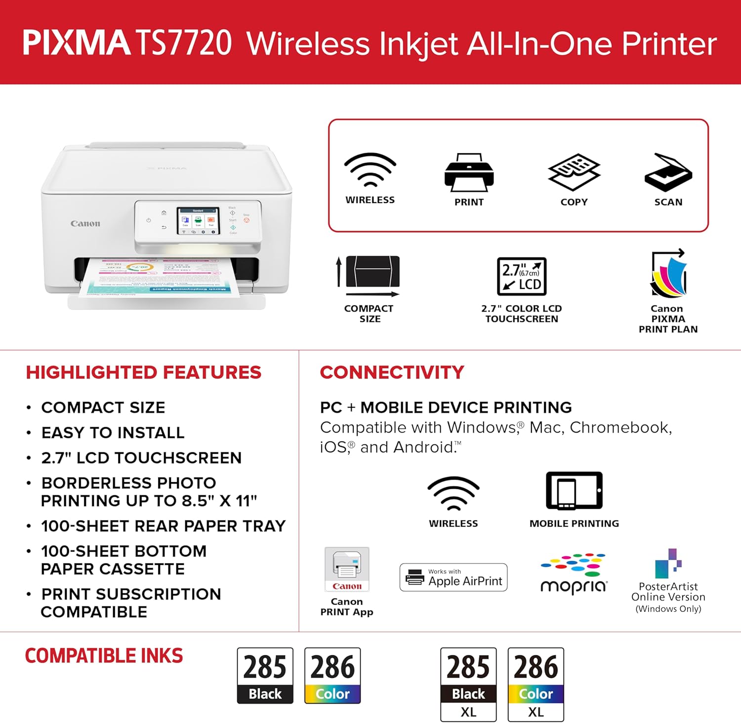 The Canon PIXMA TS7720 is a wireless all-in-one printer designed for home use. With easy setup, high-quality printing, and versatile media support, this printer is perfect for everyday printing needs. Features a user-friendly touchscreen and easy-to-replace ink cartridges.