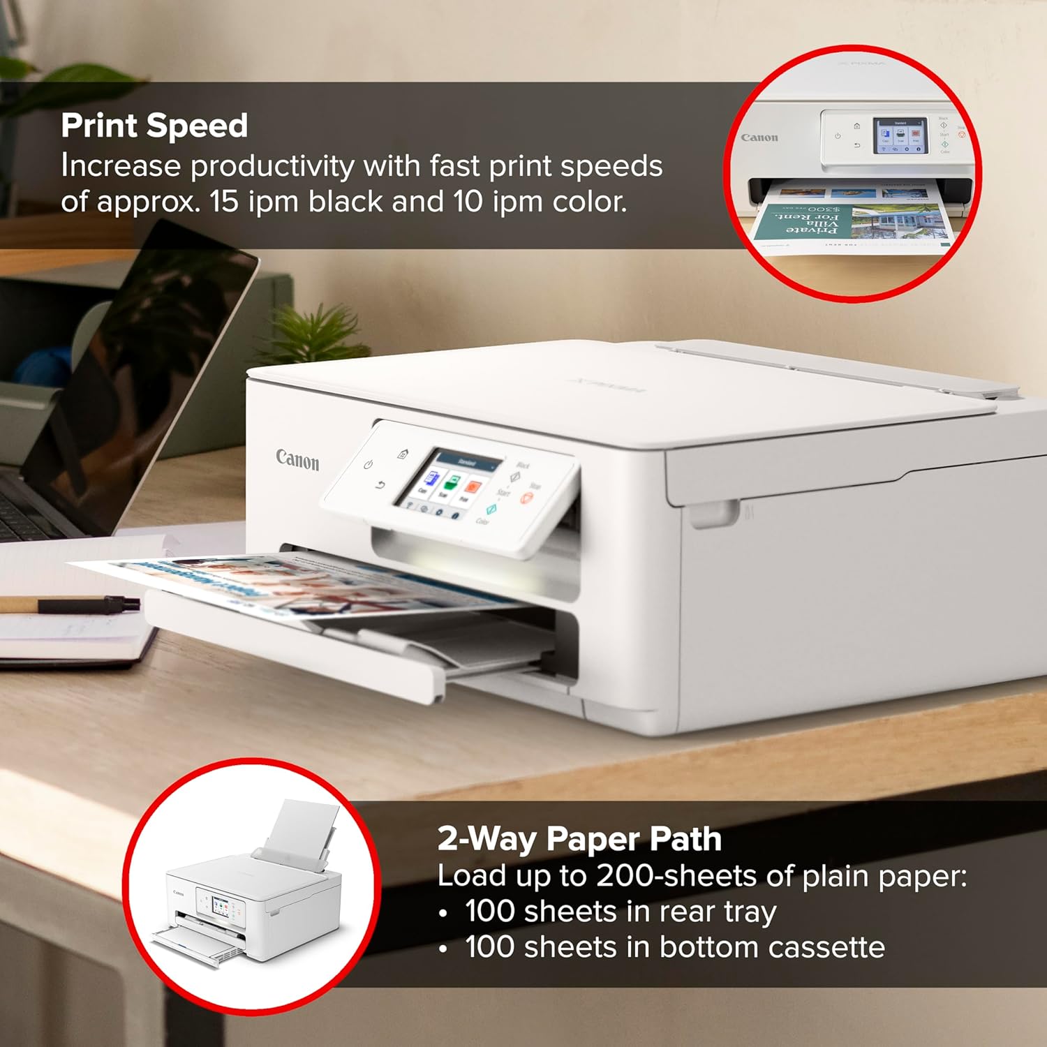 - Paper Capacity: 100 sheets (cassette), 100 sheets (rear tray)