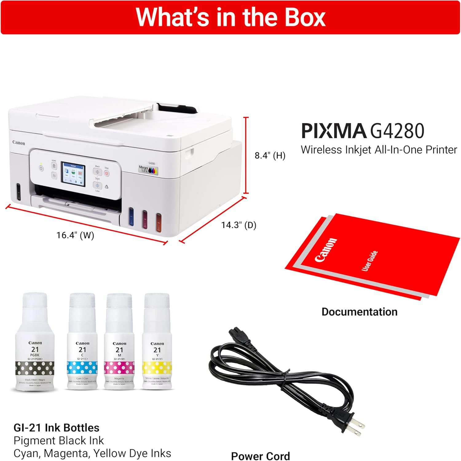 The Canon MegaTank G4280 All-in-One Printer delivers high-quality printing, copying, and scanning with exceptional ink efficiency. Designed for home and home offices, this wireless printer offers a low cost per print and outstanding connectivity.