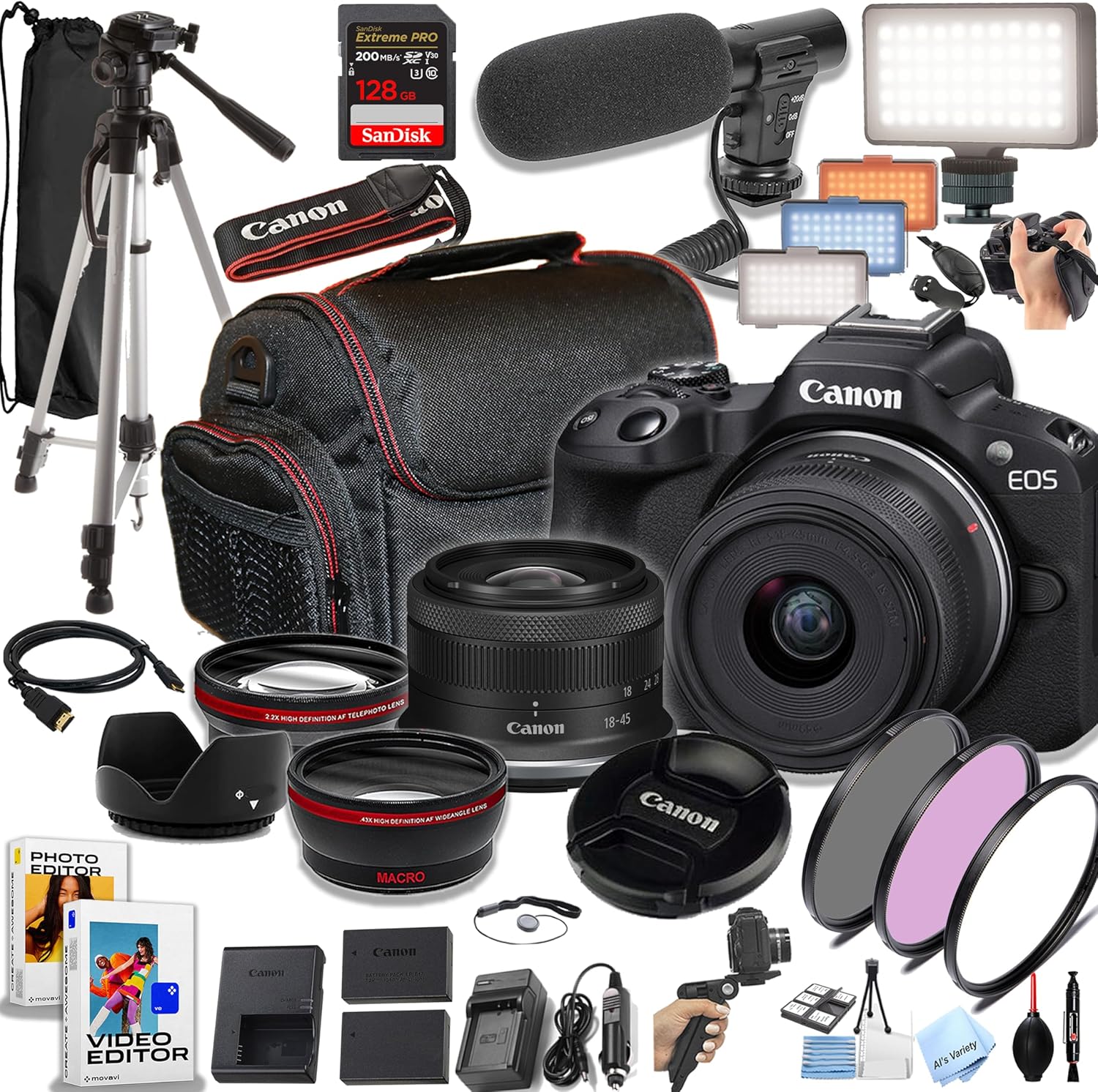- Additional Items: LED Video Light, Shot Gun Video Microphone, Tripod, Filters, Editing Software, etc.