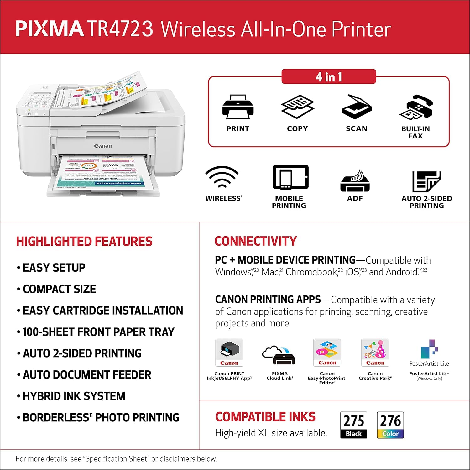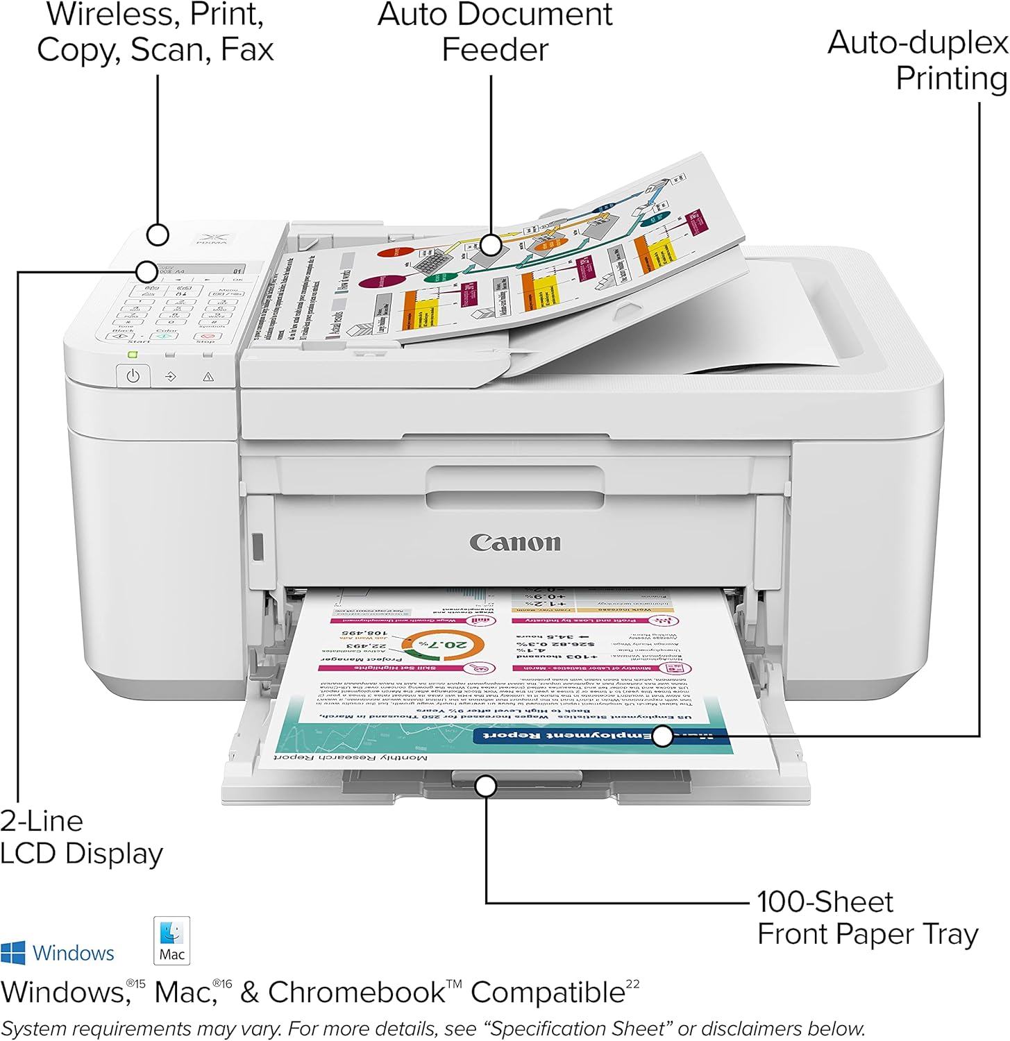 - Special Features: Auto 2-Sided Printing, 20-Sheet ADF, 2-Line LCD Display, Borderless Printing, Energy Star Certified