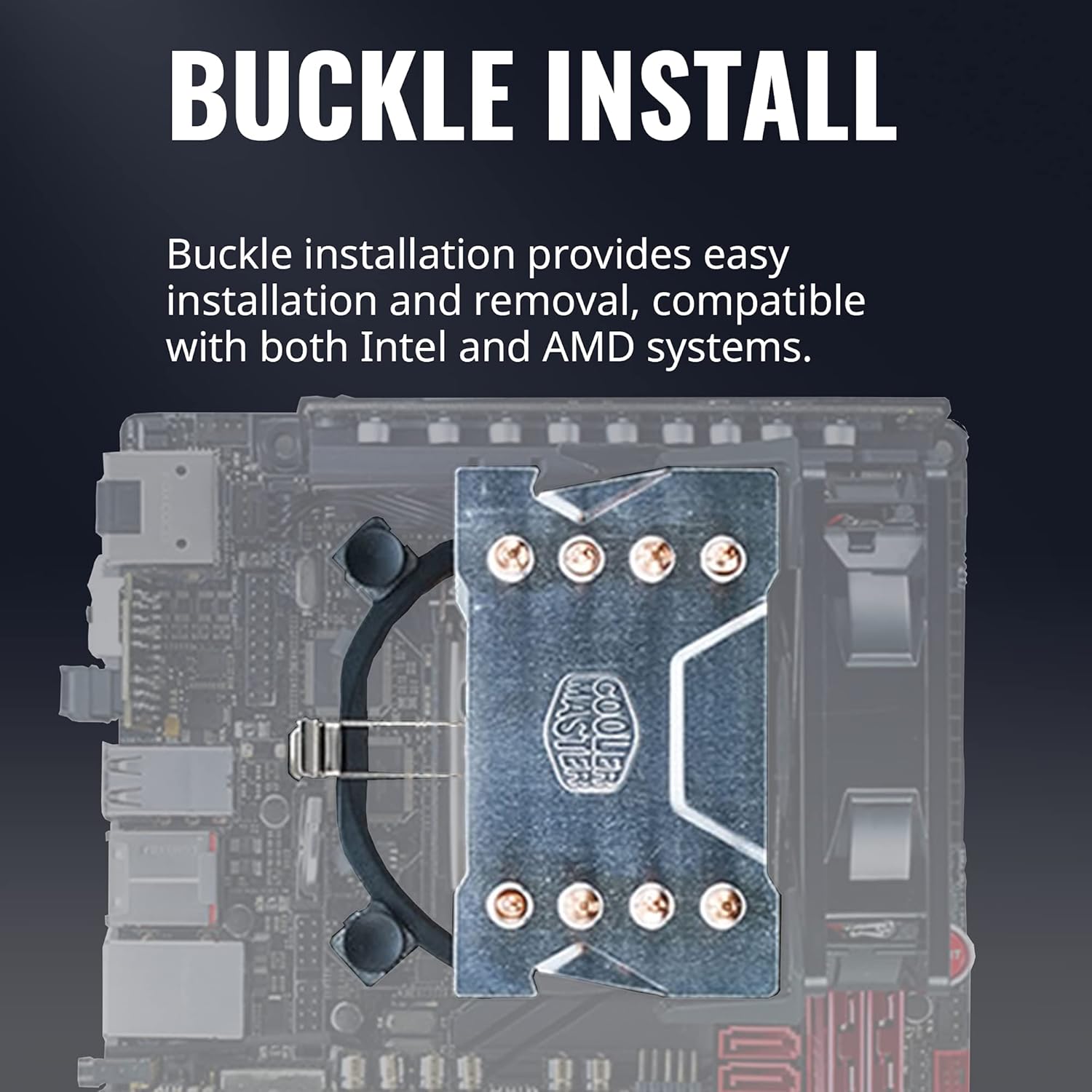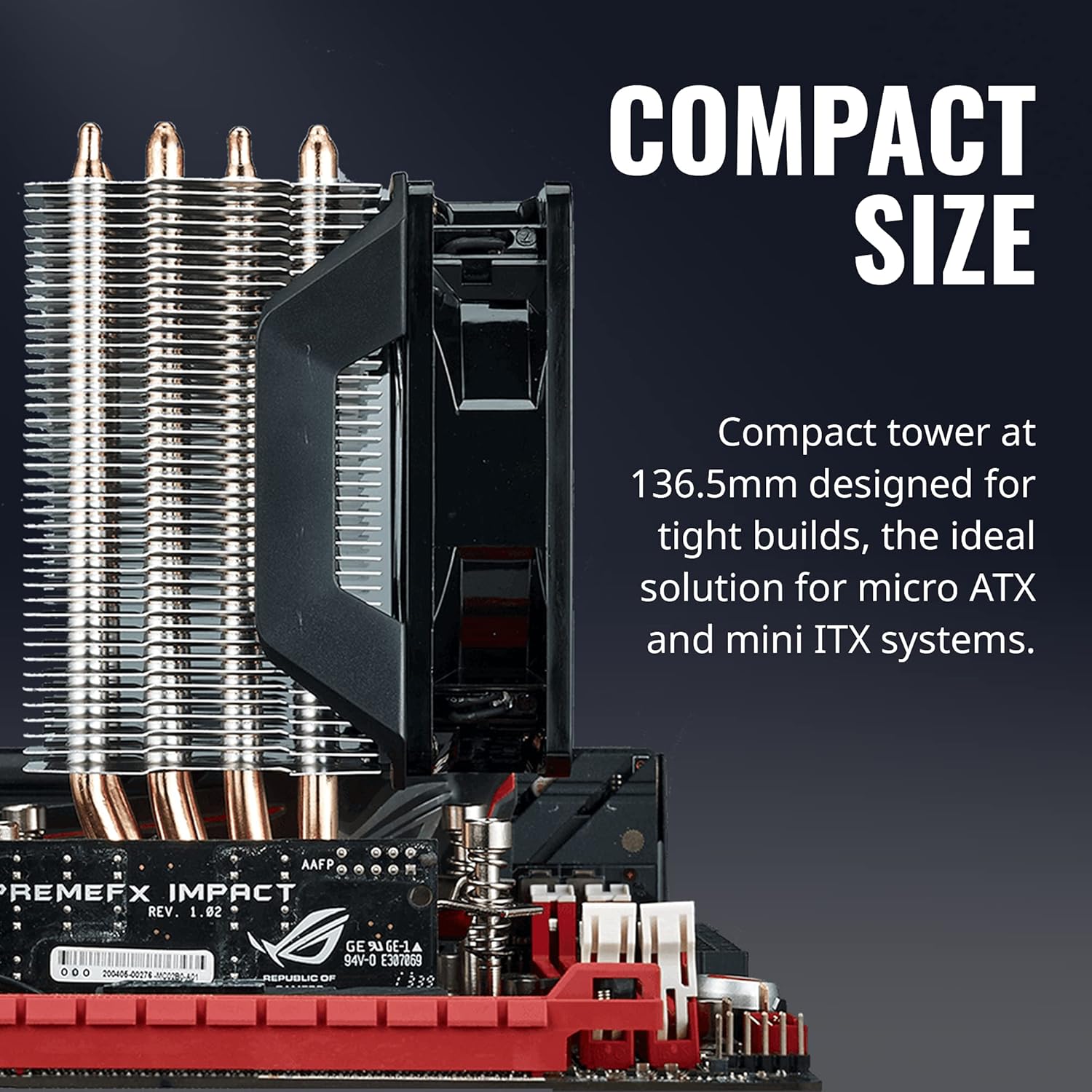 The Cooler Master Hyper H412R is a compact and efficient CPU air cooler designed to deliver exceptional cooling performance in small form factor systems. Featuring four copper heat pipes with Direct Contact technology and a 92mm PWM fan, it provides optimized airflow and efficient heat dissipation for both AMD Ryzen and Intel LGA sockets.