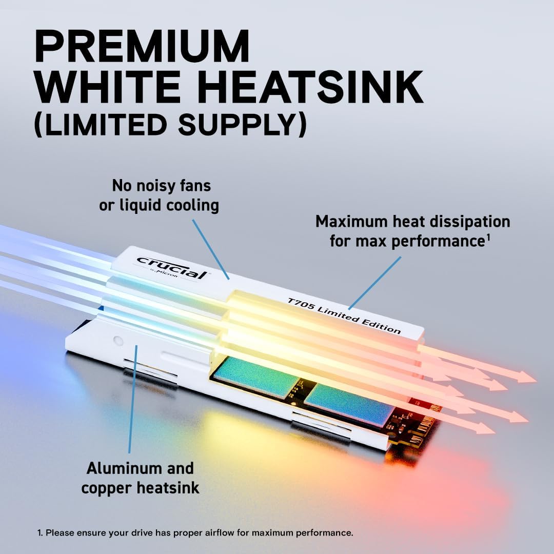 The Crucial T705 2TB PCIe Gen5 NVMe M.2 SSD with a limited-edition white heatsink pushes the boundaries of storage performance. Engineered for gamers, content creators, and professionals, this internal solid-state drive delivers blistering speeds and exceptional cooling.