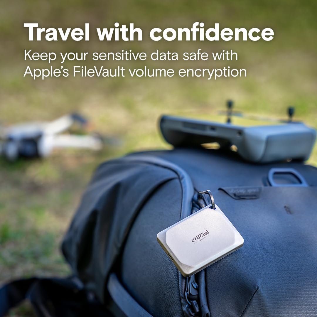 **Specifications:** * **Brand:** Crucial * **Model:** CT2000X9PROMACSSD9B02 * **Capacity:** 2TB * **Interface:** USB 3.2 * **Read Speed:** Up to 1050MB/s * **Write Speed:** Up to 1050MB/s * **Compatibility:** Mac, iPad, iPhone 15 Pro/Pro Max, iMovie, Photos * **Durability:** IP55 Water and Dust Resistant, Drop-Proof up to 2 meters * **Security:** Apple FileVault Volume, 256-bit AES Password Encryption * **Color:** Light Gold * **Includes:** USB Type-C to C CableWe partner with Amazon and other retailers to provide accurate product information and convenient access to purchase options. As an Amazon Associate we earn from qualifying purchases.