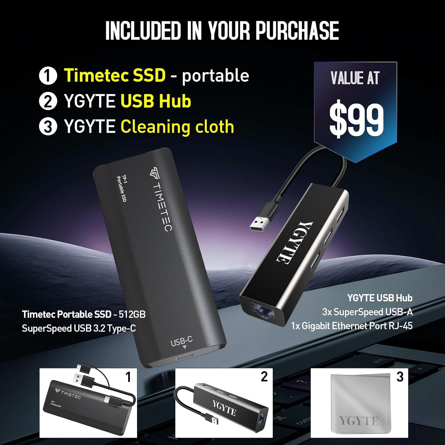 - Accessory Suite: USB Hub with RJ-45 + 512GB Portable SSD