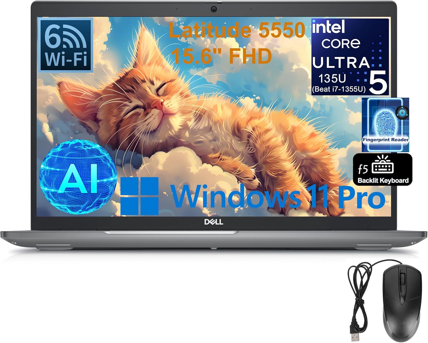 * **Brand:** Dell * **Model:** Latitude 5550 * **Processor:** Intel Core Ultra 5 135U (12MB Cache, 12 Cores, 14 Threads, Up to 4.3 GHz Max Turbo) * **Operating System:** Windows 11 Pro English (64-bit) * **Display:** 15.6" FHD (1920x1080), 60Hz, IPS, Non-Touch, Anti-Glare, 250 nit, 45% NTSC * **Graphics:** Intel Graphics and AI Accelerators with NPU for Intel AI Boost * **Memory:** 64GB DDR5 SDRAM * **Storage:** 2TB M.2 PCIe NVMe Solid State Drive * **Wireless:** Wi-Fi 6, Bluetooth 5.3 * **Camera:** 1080p at 30 fps, FHD RGB camera, Dual-array microphones * **Audio:** Stereo speakers with Realtek Waves MaxxAudio 13.0, 2W x2 = 4W total * **Keyboard:** English US backlit AI hotkey keyboard with numeric keypad, 99-key * **Ports:** * 2 x Thunderbolt 4 (40 Gbps) with DisplayPort Alt Mode/USB Type-C/USB4/Power Delivery * 1 x USB 3.2 Gen1 with PowerShare * 1 x HDMI 2.1 port * 1 x Universal audio port * 1 x USB 3.2 Gen 1 * 1 x RJ-45 Ethernet port * 1 x MicroSD-card slot * **Security:** Dell SafeID Fingerprint Reader, Control Vault 3+ * **Battery:** 3-cell, 54 WhWe partner with Amazon and other retailers to provide accurate product information and convenient access to purchase options. As an Amazon Associate we earn from qualifying purchases.