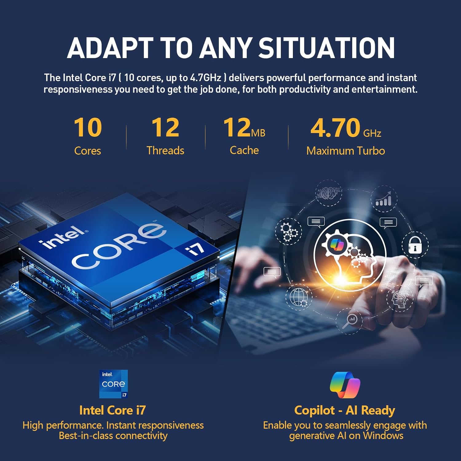 - Processor: Intel Core i7 (12 MB cache, 10 cores, 12 threads, up to 4.70 GHz Turbo)