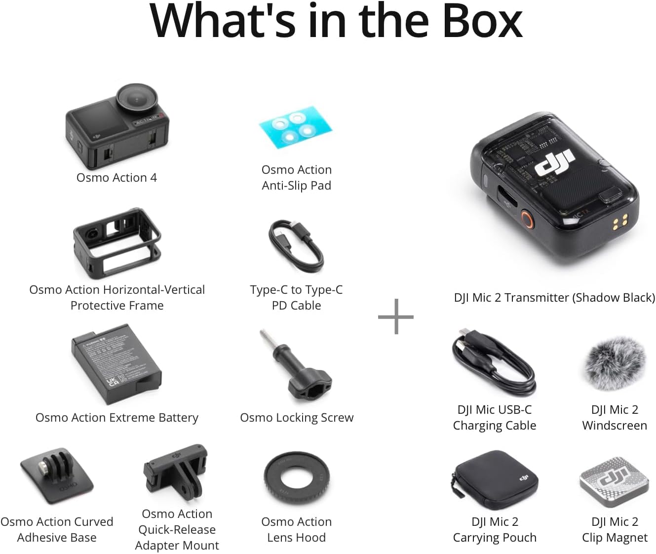 - Includes: Osmo Action 4 Standard Combo, DJI Mic 2 Transmitter