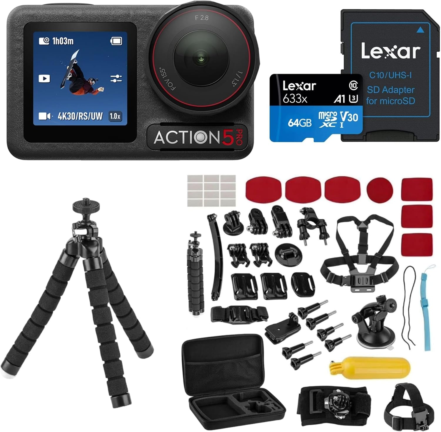 * **Brand:** DJI * **Model:** DJI Osmo Action 5 Pro * **Sensor Size:** 1/1.3-inch * **Video Resolution:** 4K * **Video Capture Format:** MP4 * **Maximum Focal Length:** 24 Millimeters * **Screen Size:** 2.5 Inches * **Color:** Black * **Features:** Waterproof, Dual OLED Touchscreens, Action Camera 4K With 1/1.3" sensor, Enhanced Subject Tracking, Anti-Shake, Low Light * **Camcorder Type:** Action Camera * **Flash Memory Type:** Micro SDWe partner with Amazon and other retailers to provide accurate product information and convenient access to purchase options. As an Amazon Associate we earn from qualifying purchases.