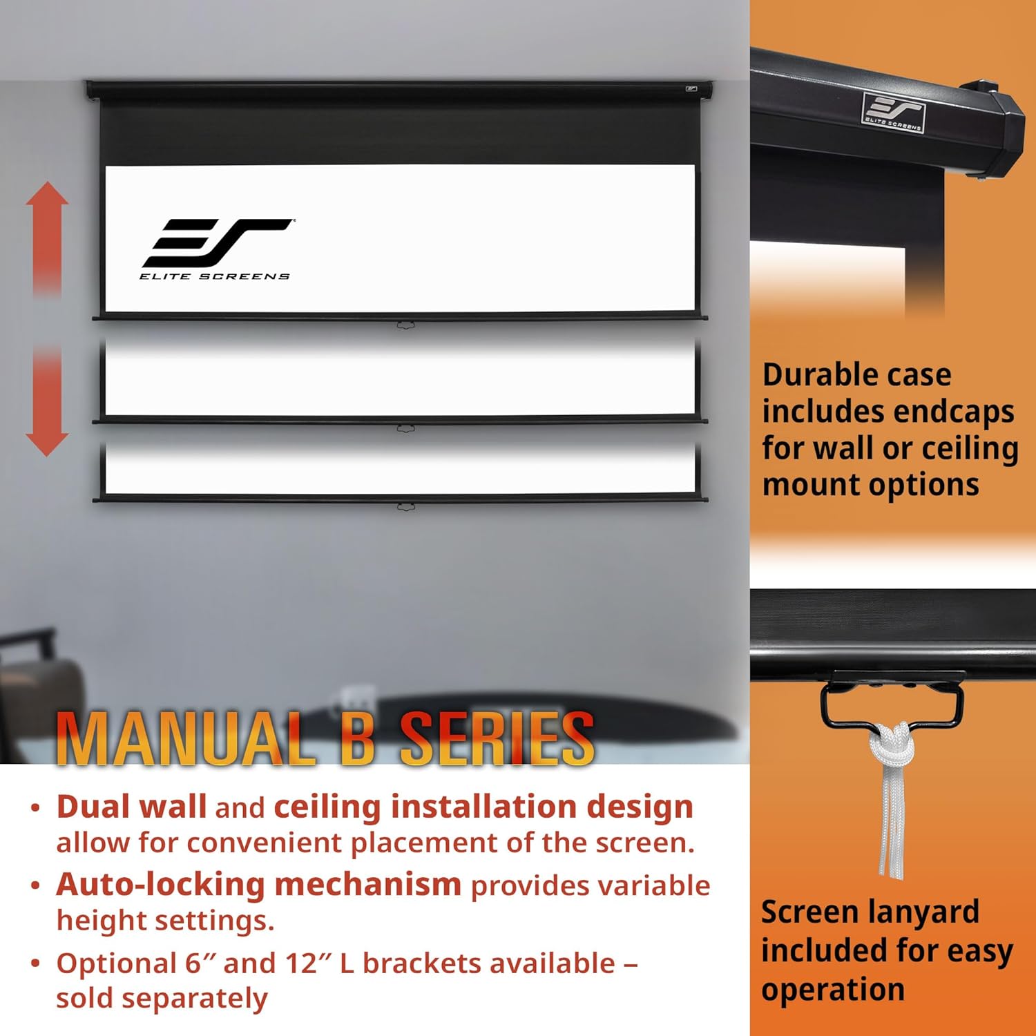 The Elite Screens Manual B Series is a versatile and reliable manual pull-down projector screen, perfect for home theaters, gaming setups, and presentations. Featuring a high-quality MaxWhite 2 material, this screen ensures vivid and clear images with wide viewing angles.