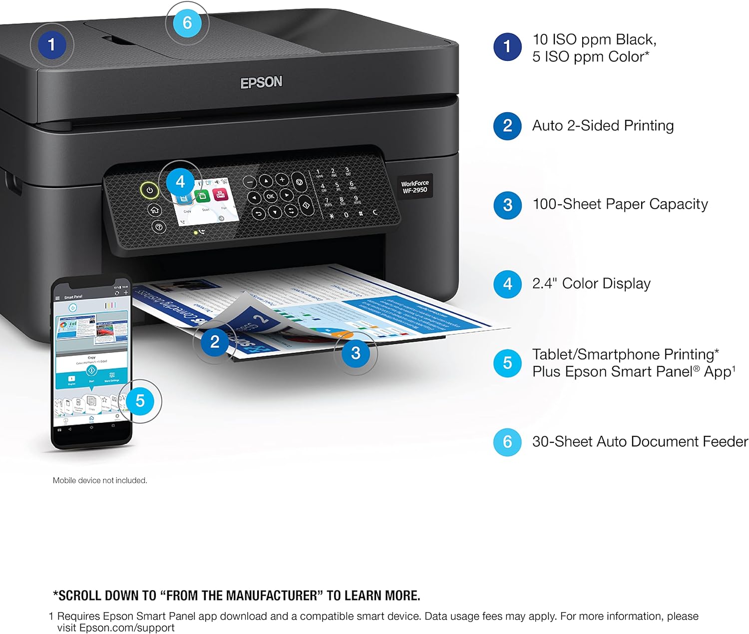 With convenient wireless connectivity, automatic 2-sided printing, and individual ink cartridges, the WF-2950 offers exceptional versatility and economy. The Epson Smart Panel app enables effortless setup and operation from your smartphone or tablet. Whether you're printing documents, creating searchable PDFs, or printing on-the-go with voice activation, the Epson WorkForce WF-2950 simplifies your printing tasks while delivering reliable performance.