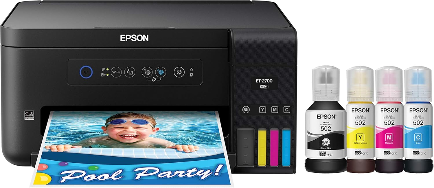 - Included Components: Power cord, Expression ET-2700 EcoTank all-in-one, 1x bottle each 502 Cyan, Magenta, Yellow (70 mL), CD-ROM for product setup, manual, 1x bottle 502 Black (127 mL)
