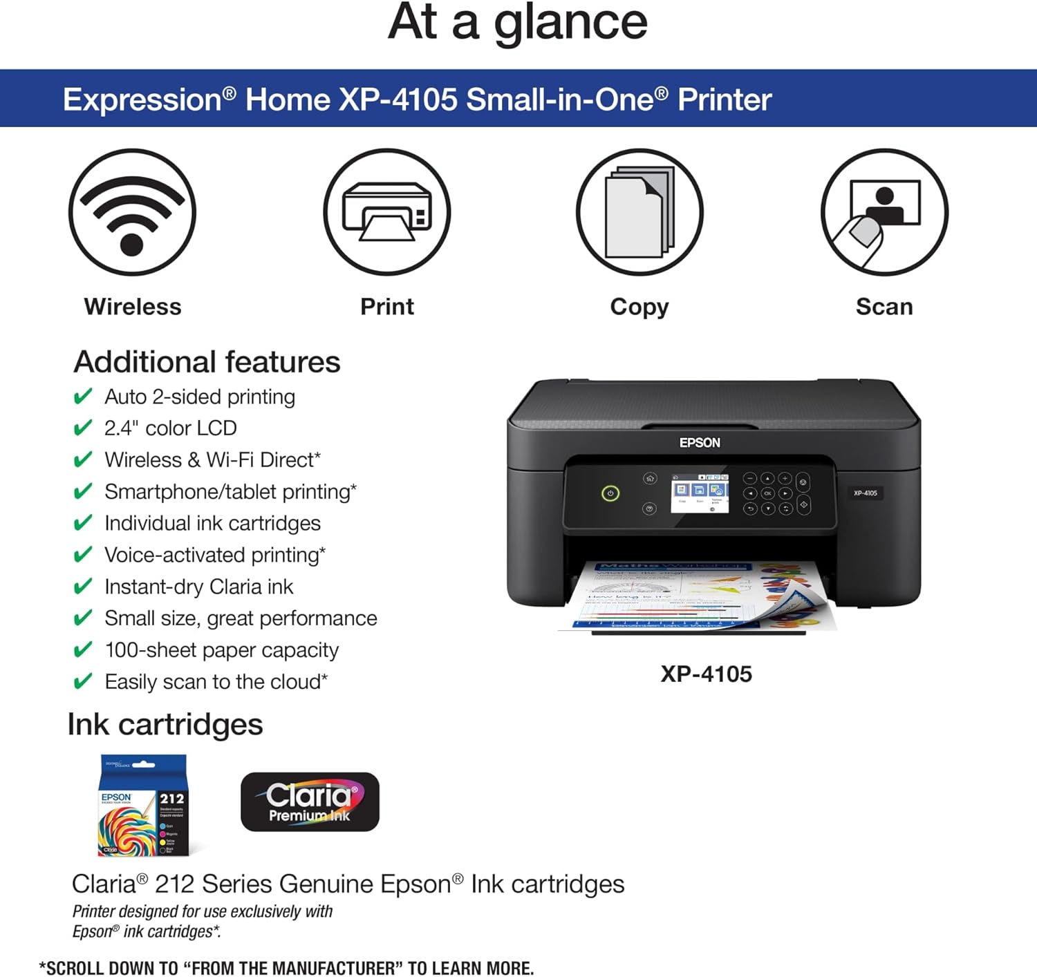 Introducing the Epson Expression Home XP-4105, a versatile all-in-one wireless inkjet printer designed to meet all your home printing, copying, and scanning needs. With voice activation and auto 2-sided printing, it simplifies everyday tasks while delivering high-quality results.