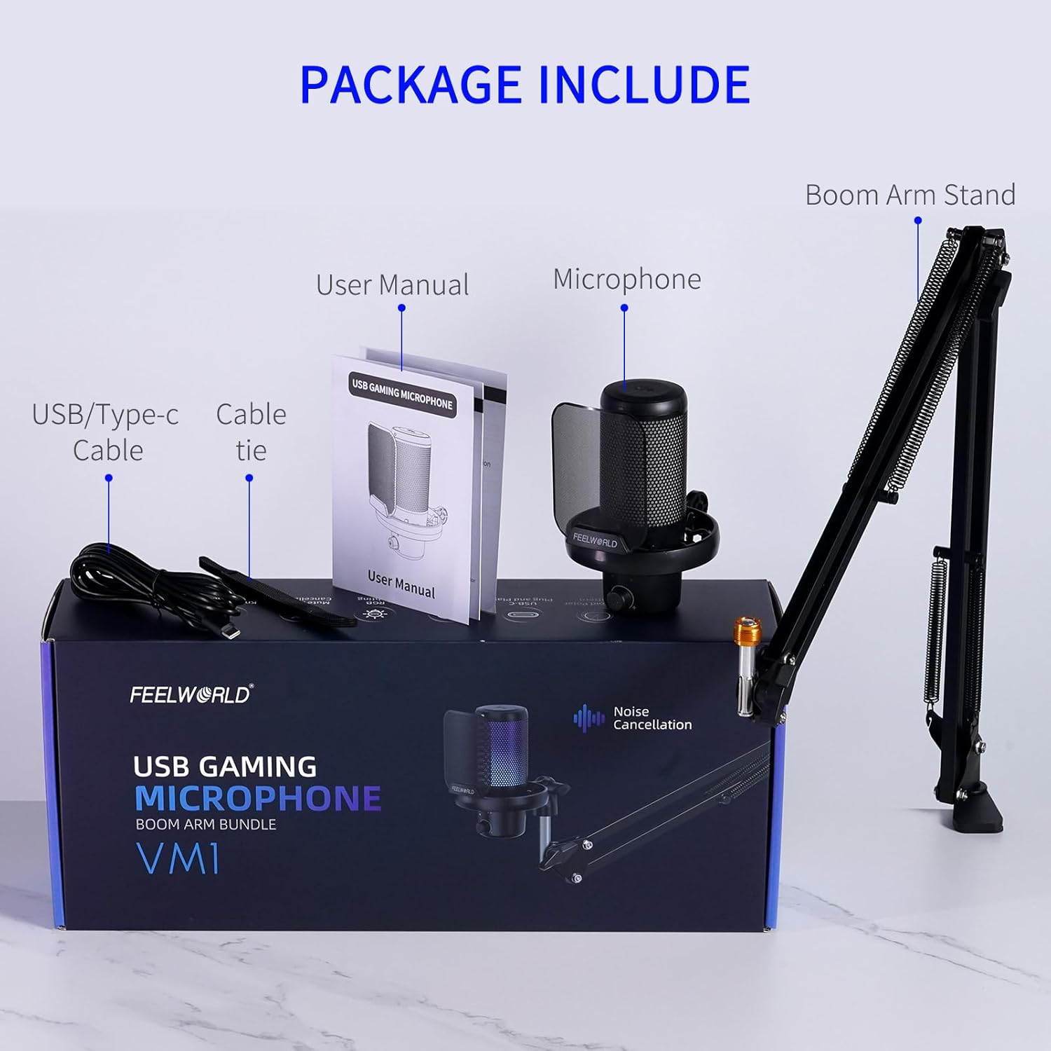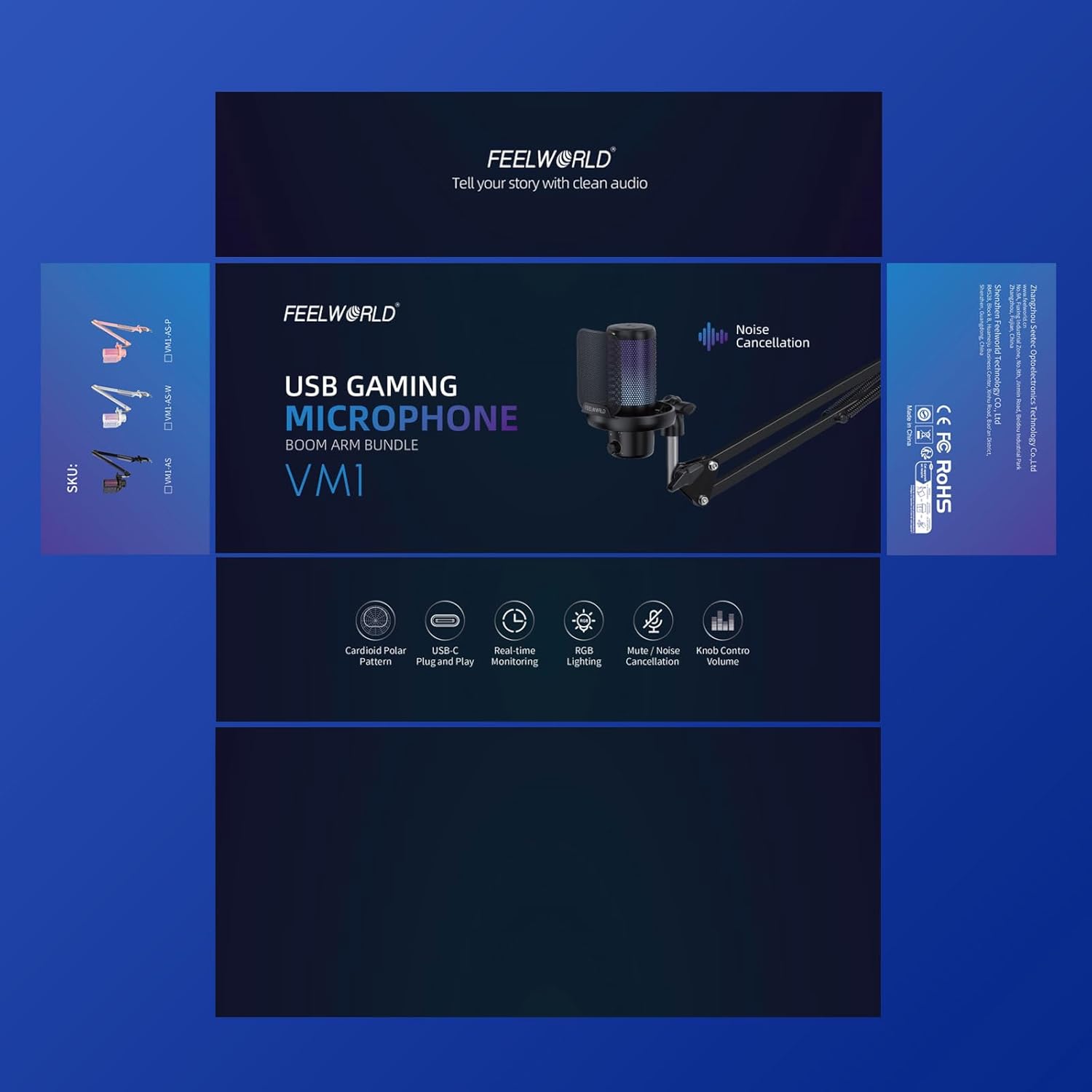 The FEELWORLD VM1 Gaming PC USB Microphone is designed to deliver exceptional audio quality for gamers, YouTubers, Twitch streamers, and podcasters. With noise cancellation, mute function, and dynamic RGB lighting, this microphone enhances your recording and streaming experience.