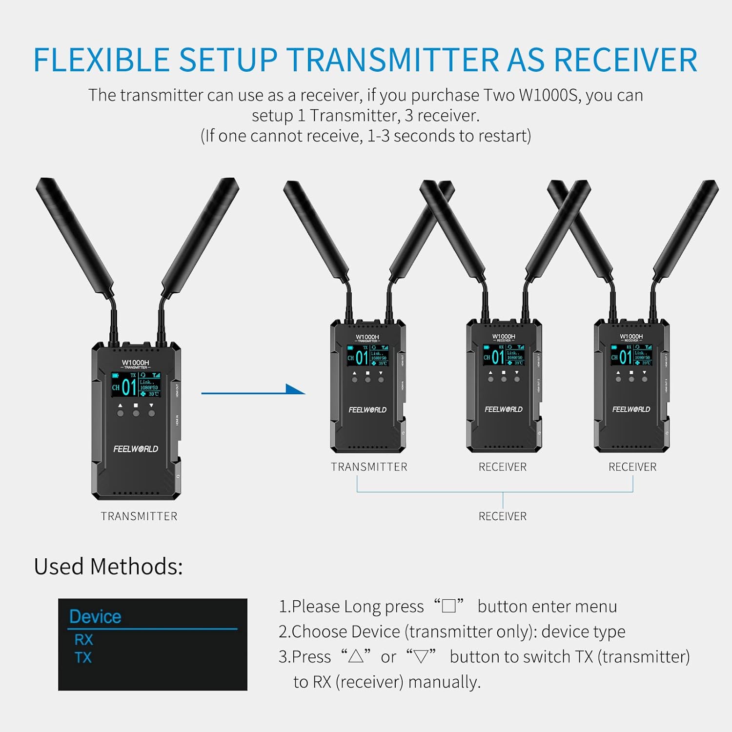 Introducing the FEELWORLD W1000H Wireless HDMI Video Transmission System. This system includes both a transmitter and receiver, offering a stable and efficient solution for live streaming and video production. It ensures real-time intercom, reliable transmission, and fast live streaming capabilities.