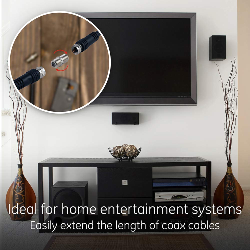 The GE Coaxial Cable Extension Adapter allows you to seamlessly connect two coaxial cables, extending their reach without signal loss. This 2-pack of female-to-female connectors is compatible with RG59 and RG6 F-type coax cables, making it an essential tool for any home theater or cable setup.