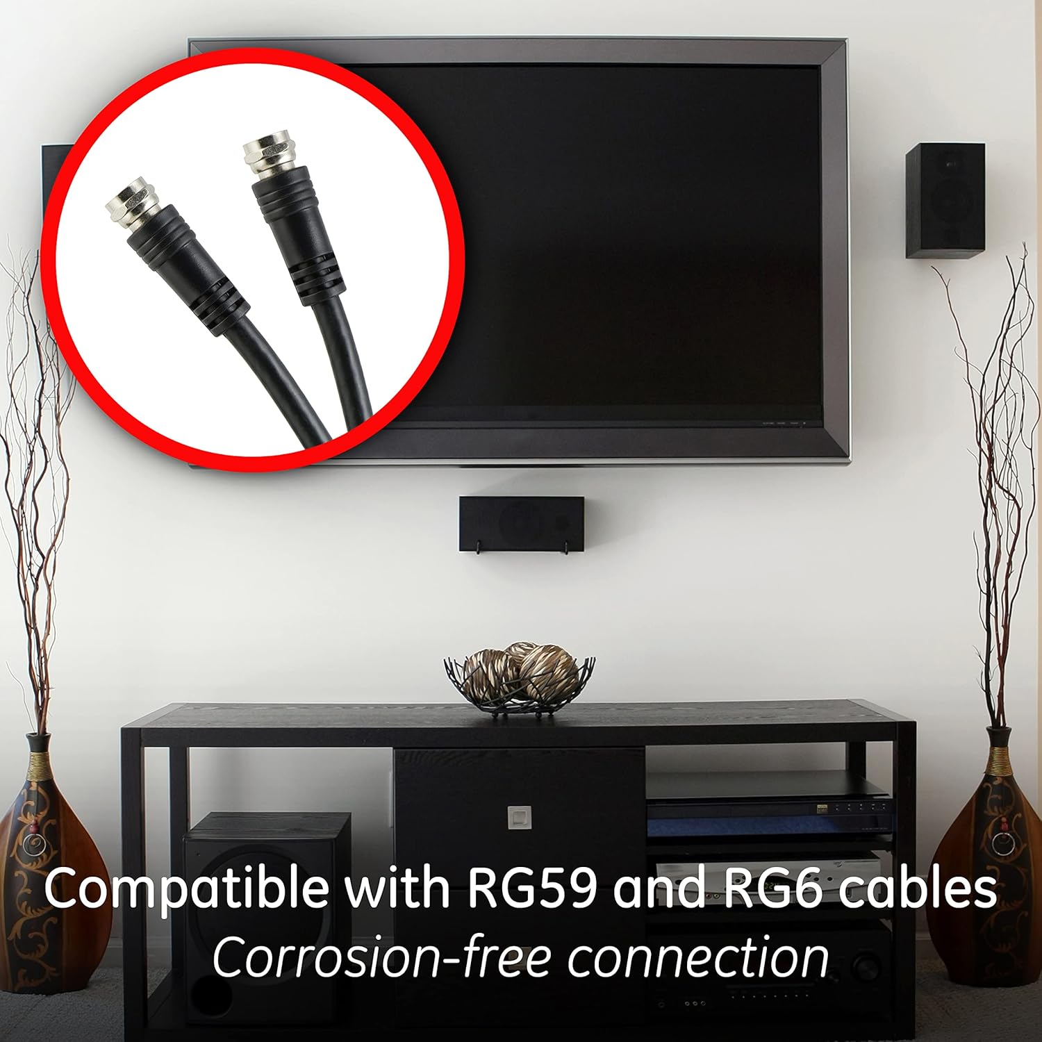 The GE 4-Way Coaxial Cable Splitter allows you to split a single coaxial cable signal into multiple outputs. Ideal for distributing HD TV, cable TV, or antenna signals to multiple devices, this splitter ensures reliable connections and optimal signal quality.