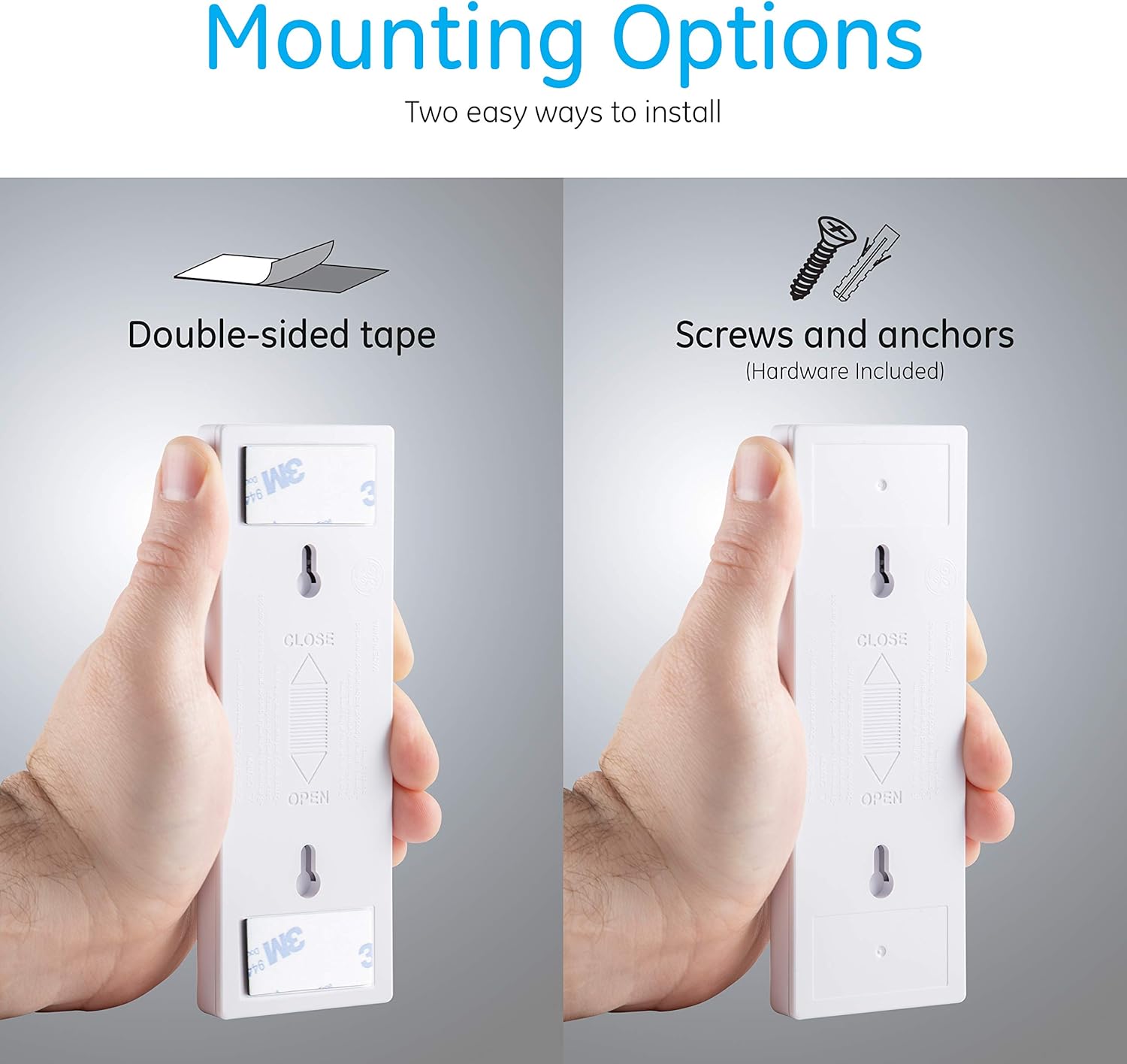 - Mounting: Screws, anchors, and double-sided tape included