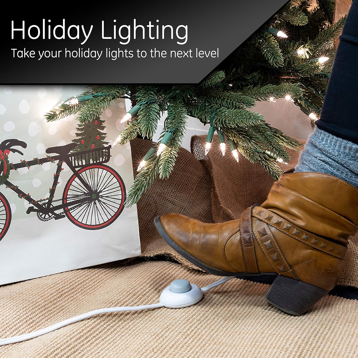 The GE Extension Cord with Footswitch offers convenient power control for lamps and other devices. Featuring a footswitch and multiple outlets, it simplifies home and holiday lighting setups.