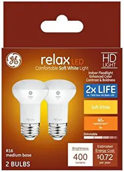 GE Relax HD Soft White LED R16 Indoor Floodlight Bulbs provide enhanced color contrast and boldness, creating a comfortable and cozy light. These dimmable bulbs are ideal for bedroom, foyer, family room, and dining room lighting, offering long-lasting performance and energy savings.