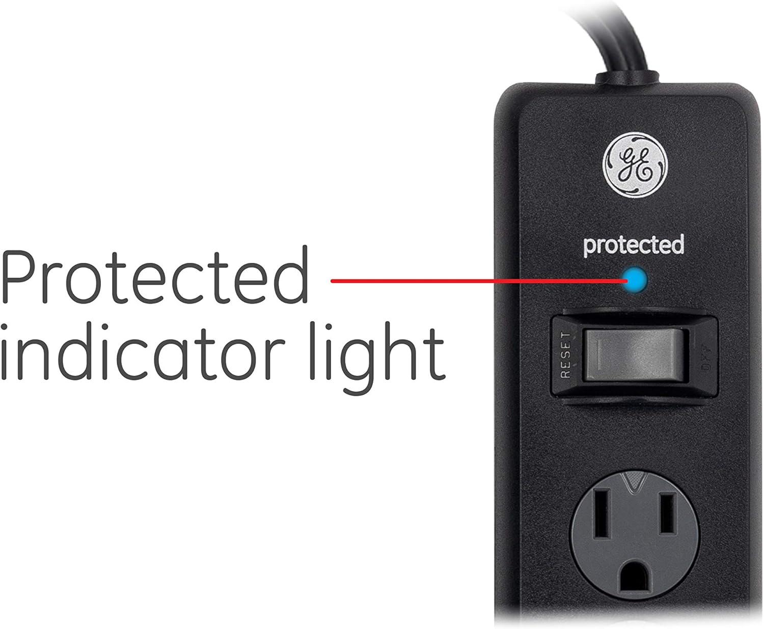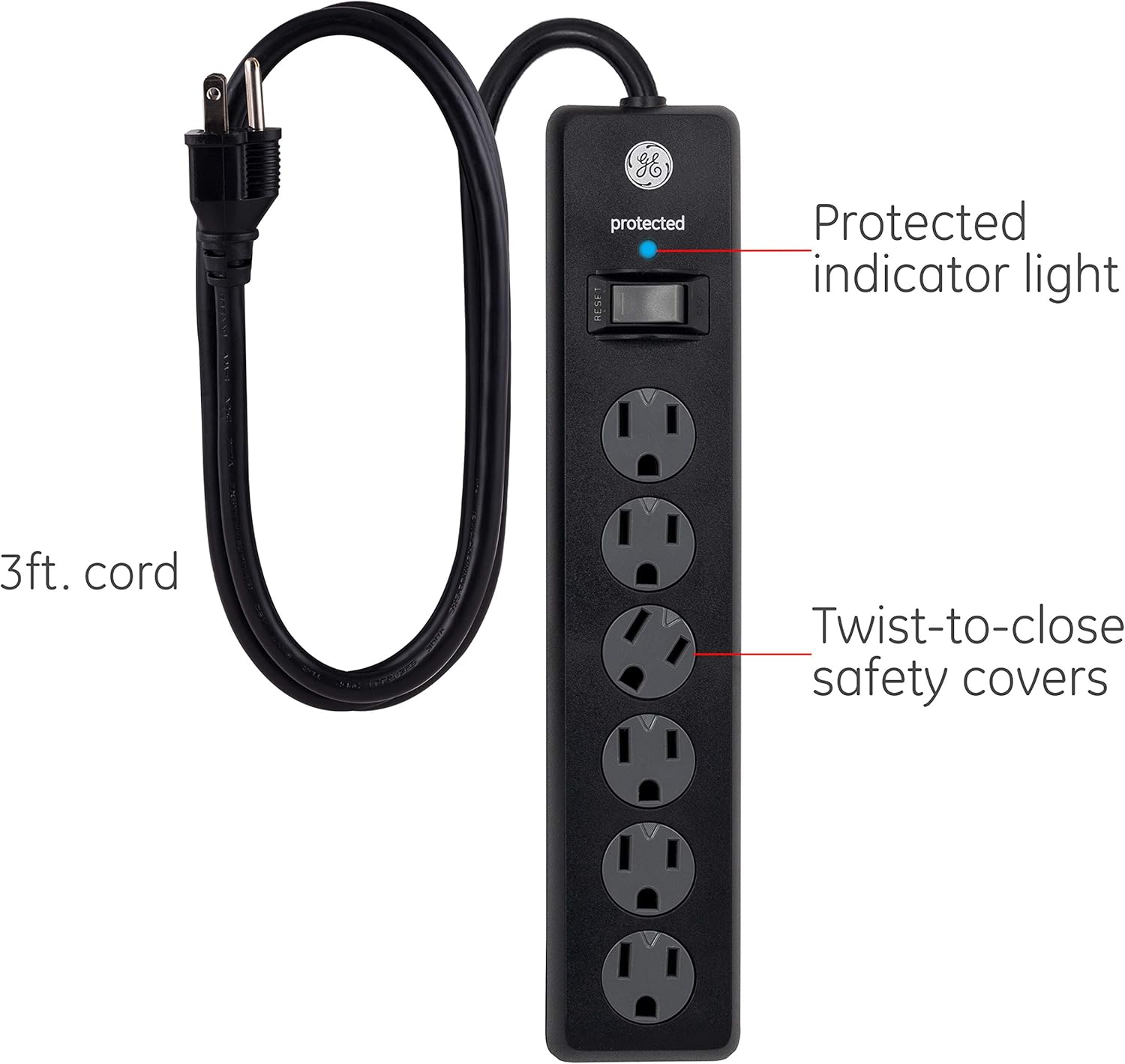 The GE 6-Outlet Surge Protector provides expanded power access with reliable surge protection. Featuring six grounded outlets, 800 Joules of surge protection, and a 3 ft extension cord, this surge protector is ideal for home, office, or workshop use. Enhanced with twist-to-close safety covers and a protected indicator light for added safety and convenience.