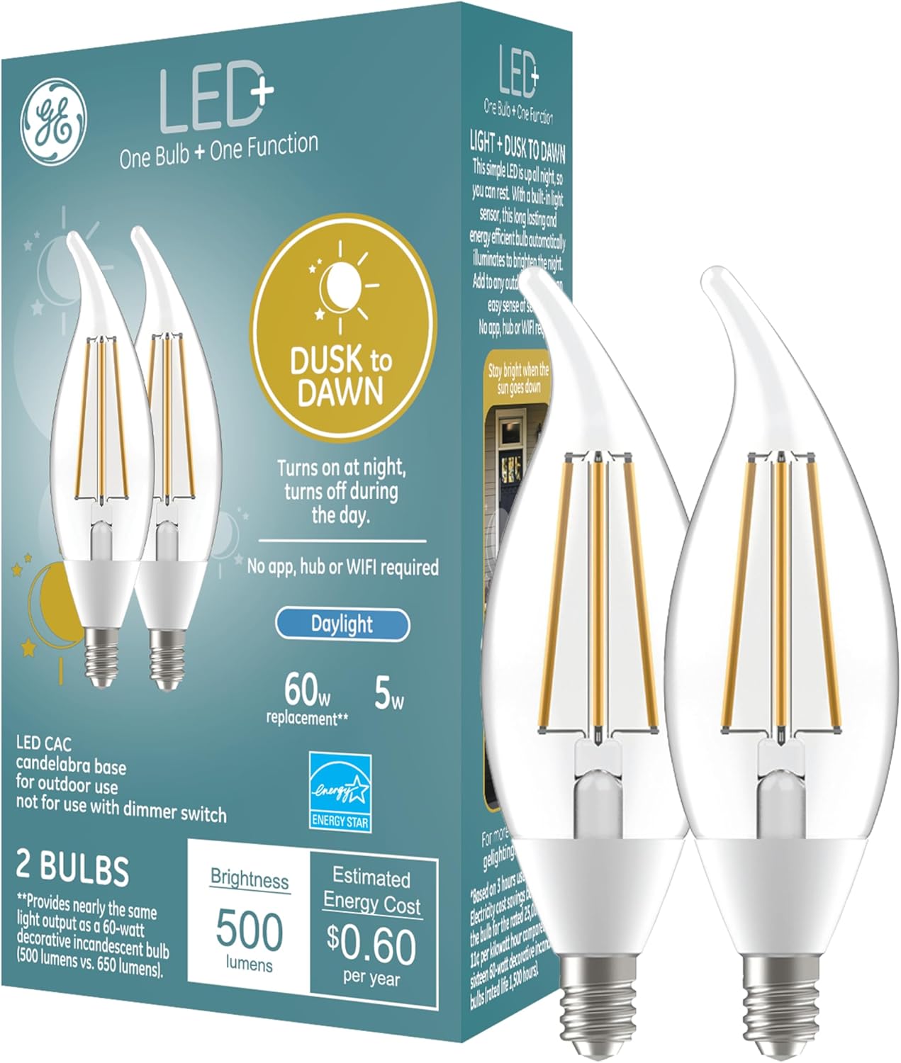 Introducing the GE LED+ Dusk to Dawn light bulbs, a simple and effective way to automate your outdoor lighting. These bulbs automatically switch on at dusk and off at dawn, providing security and convenience without the need for timers or apps. Designed for use in any standard E12 candelabra base, these bulbs offer long-lasting, energy-efficient illumination.