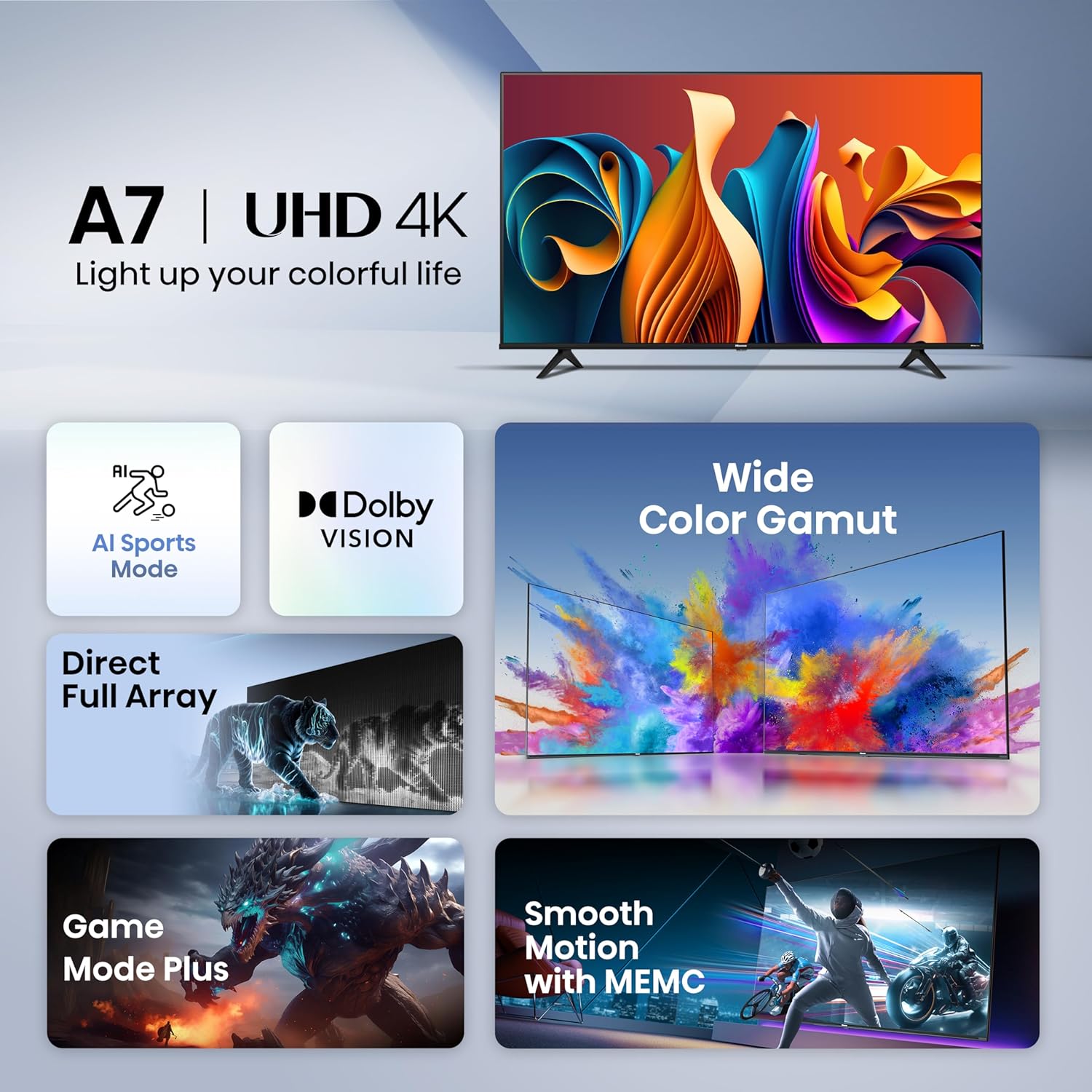 Dive into stunning visuals and immersive sound with the Hisense A7 Series 4K UHD Smart Google TV. Featuring Wide Color Gamut technology, Dolby Vision HDR, and DTS Virtual:X, this TV delivers a cinematic experience right in your living room. Game Mode Plus ensures a smooth, lag-free gaming experience.