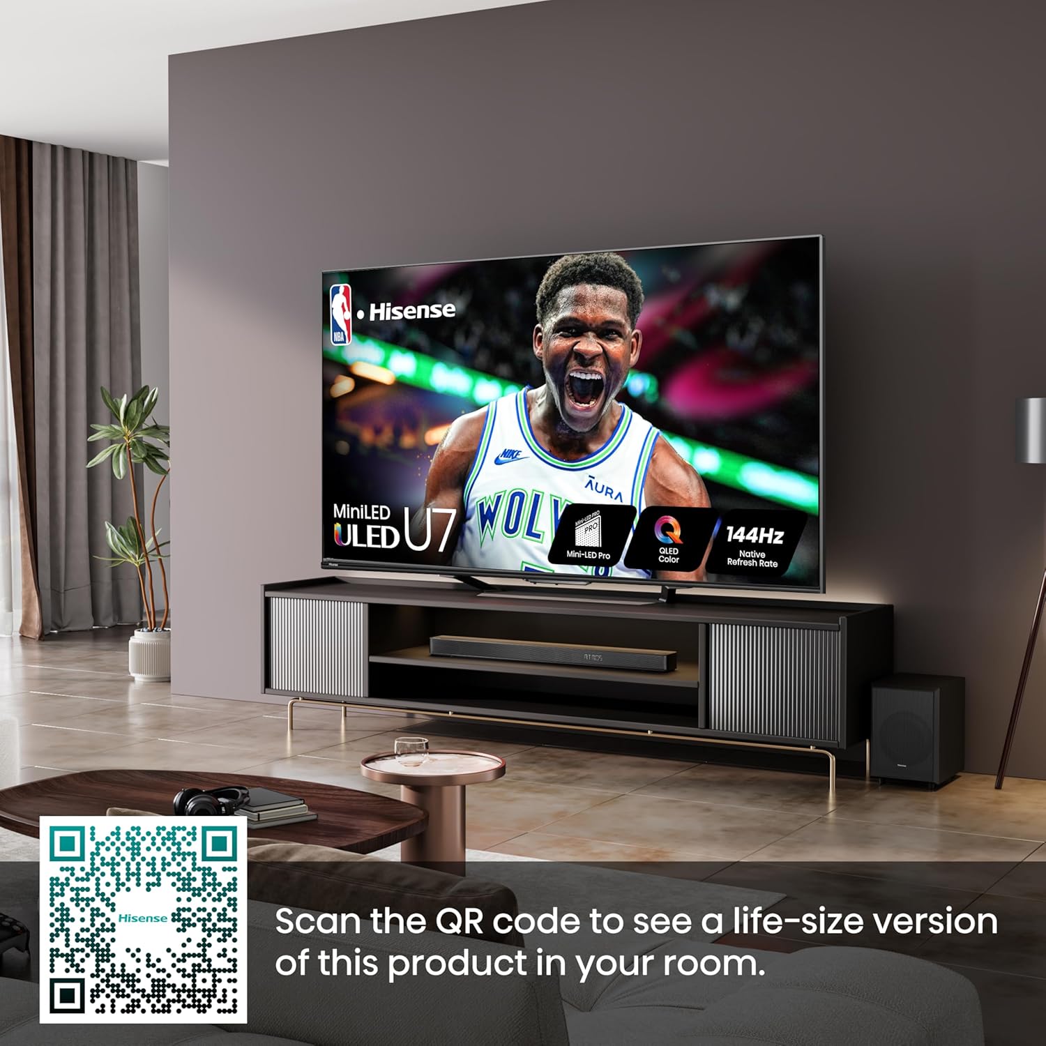 The Hisense 55U7N ULED 4K Smart TV is engineered to redefine your viewing experience with advanced technologies and stunning visuals. Featuring Mini-LED Pro, QLED Quantum Dot technology, and a 144Hz Game Mode Pro, every detail is enhanced for exceptional clarity and color accuracy. With Dolby Vision Atmos support and a 2.1 multi-channel sound system, immerse yourself in a world of seamless picture and sound integration. This TV is also equipped with WiFi 6E, a NEXTGEN TV ATSC 3.0 tuner and a 2-year warranty, making it a future-proof addition to your home.