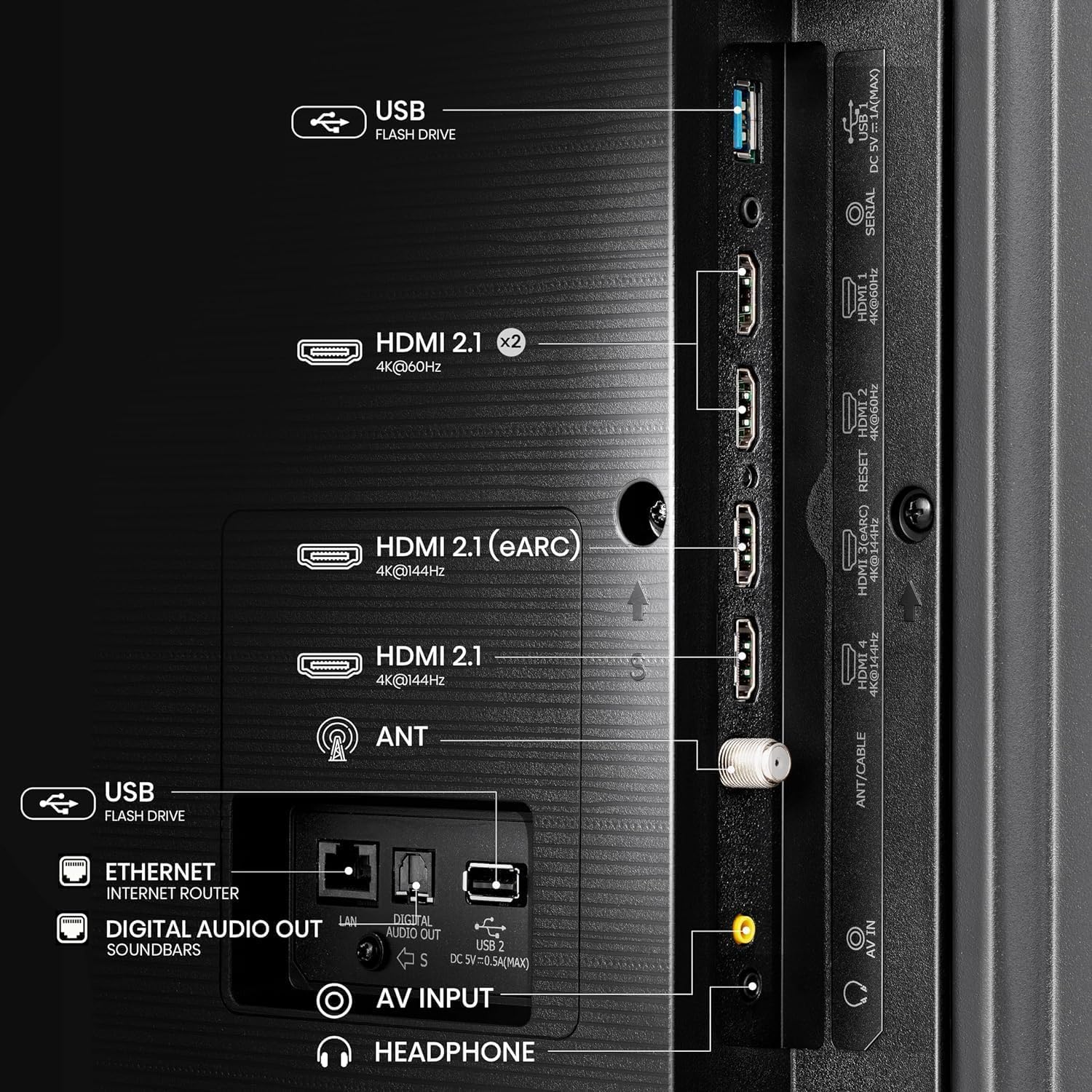 - Special Features: Full Array Local Dimming Pro, Dolby Vision IQ · Atmos, Mini-LED ULED, Native 144Hz, QLED Quantum Dot Color