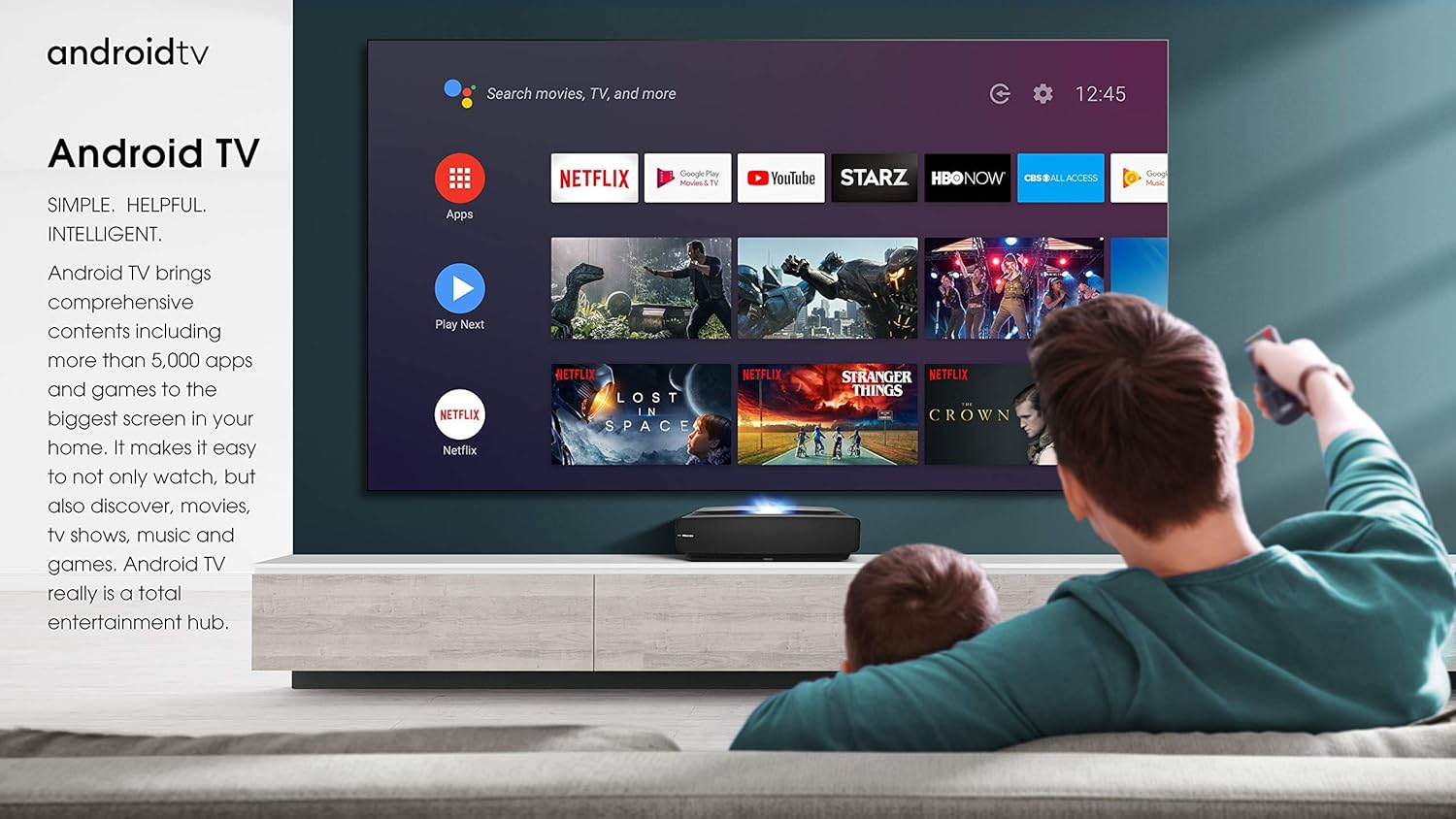 This Renewed Hisense 100L5F 100" 4K UHD Android Smart Laser TV delivers an immersive viewing experience with vibrant colors and stunning detail. Featuring DLP Technology, X-Fusion Laser Light Source, and dbx-tv cinematic sound, it brings your favorite content to life.