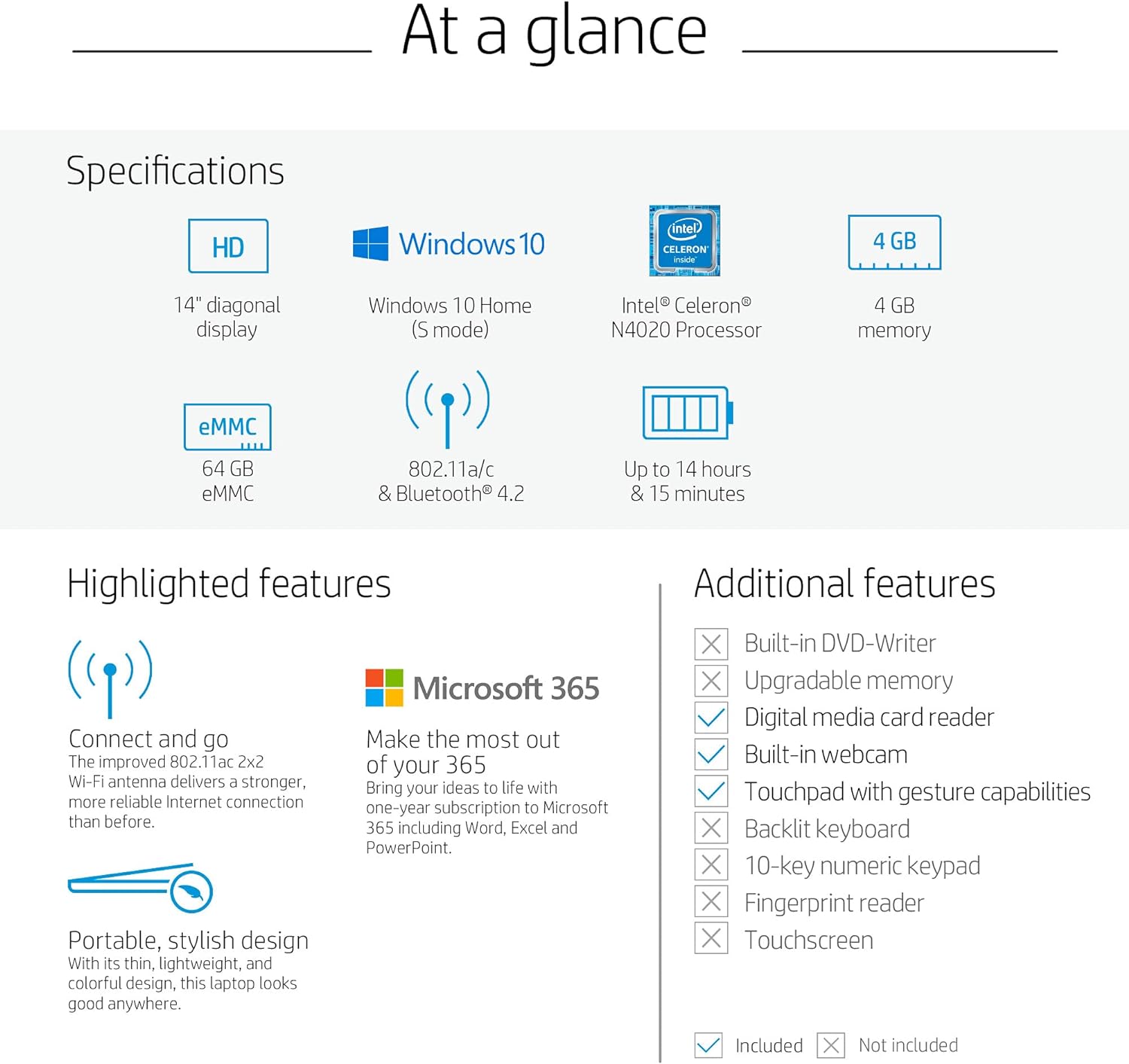 * **Brand:** HP * **Model:** 14-cb188nr * **Color:** Rose Pink * **Processor:** Intel Celeron N4000, Dual-Core, 1.1 GHz base frequency, up to 2.6 GHz burst frequency * **Memory:** 4 GB DDR4-2400 SDRAM (not upgradable) * **Storage:** 64 GB eMMC * **Display:** 14-inch diagonal HD SVA bright view WLED-backlit (1366 x 768) * **Operating System:** Windows 10 Home in S Mode * **Wireless:** 802.11 ac 2x2 Wi-Fi, Bluetooth * **Ports:** 1x USB 2.0, 2x USB 3.0 * **Battery Life:** Up to 14 hours and 15 minutes (video playback), up to 11 hours and 30 minutes (wireless streaming) * **Dimensions:** 13.27 inches (W) x 8.90 inches (D) x 0.70 inch (H) * **Weight:** 3.17 poundsWe partner with Amazon and other retailers to provide accurate product information and convenient access to purchase options. As an Amazon Associate we earn from qualifying purchases.