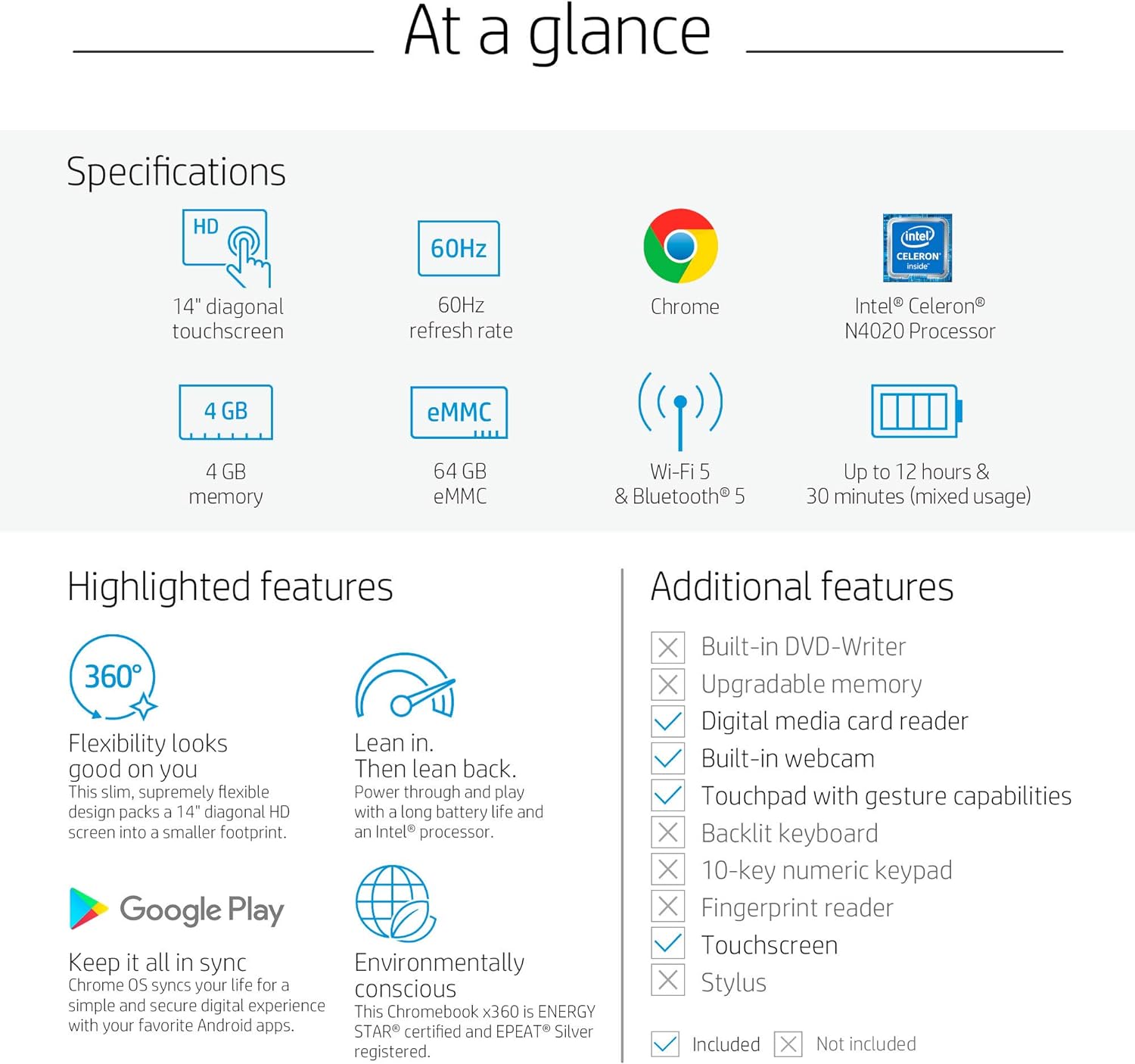 The HP Laptop X360 14a Chromebook offers a flexible computing experience with its 360-degree hinge and touchscreen display. Powered by an Intel Celeron processor, this Chromebook is perfect for everyday tasks, entertainment, and staying connected on the go.