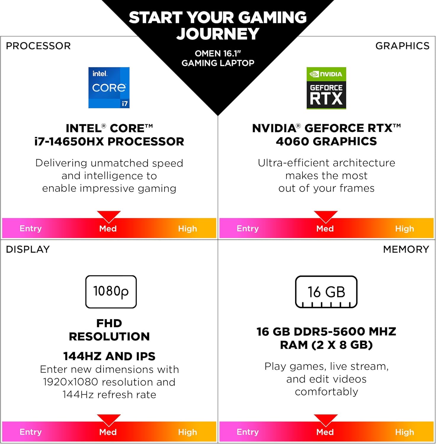 The HP OMEN 16 Gaming Laptop combines cutting-edge performance with stunning visuals, providing an immersive gaming experience. Powered by a 14th Gen Intel Core i7 processor and NVIDIA GeForce RTX 4060 graphics, it delivers smooth gameplay and exceptional detail.
