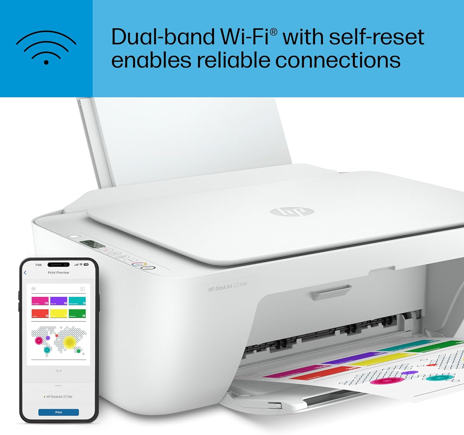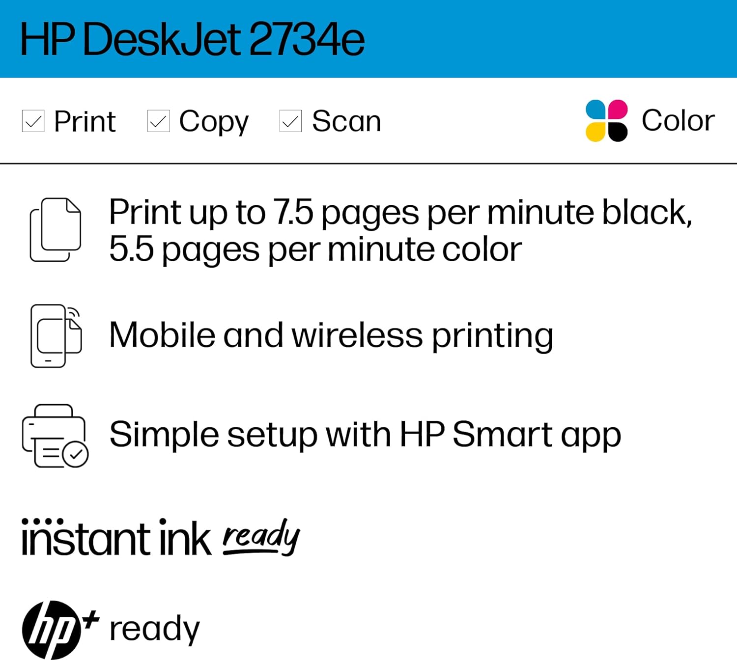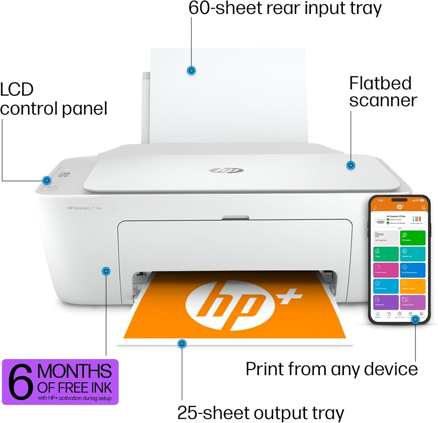 Introducing the HP DeskJet 2734e All-in-One Printer, designed for easy and reliable printing, scanning, and copying. Ideal for home use, this printer offers wireless connectivity, mobile printing, and essential features to streamline your daily tasks, plus 6 months of Instant Ink with HP+ activation.