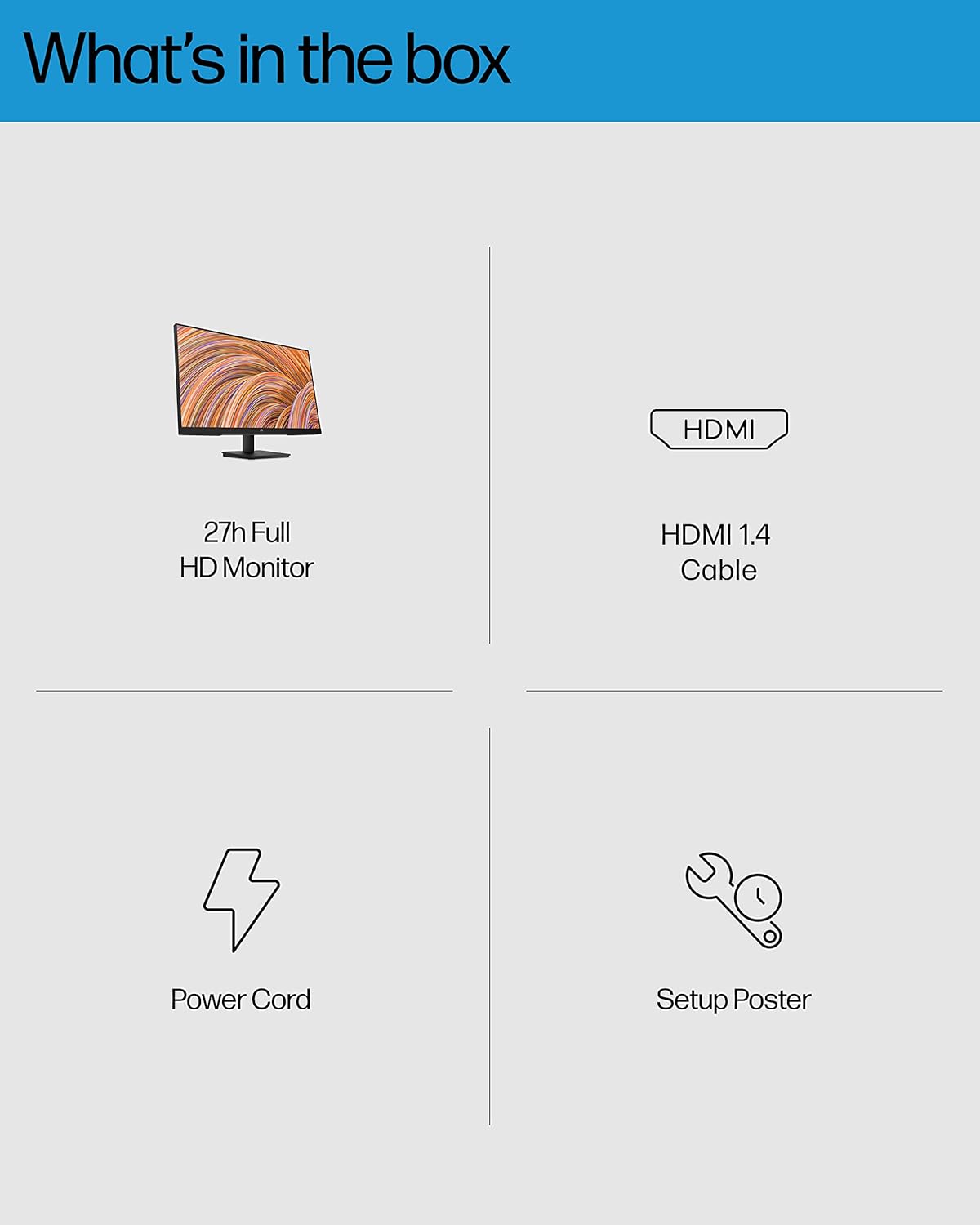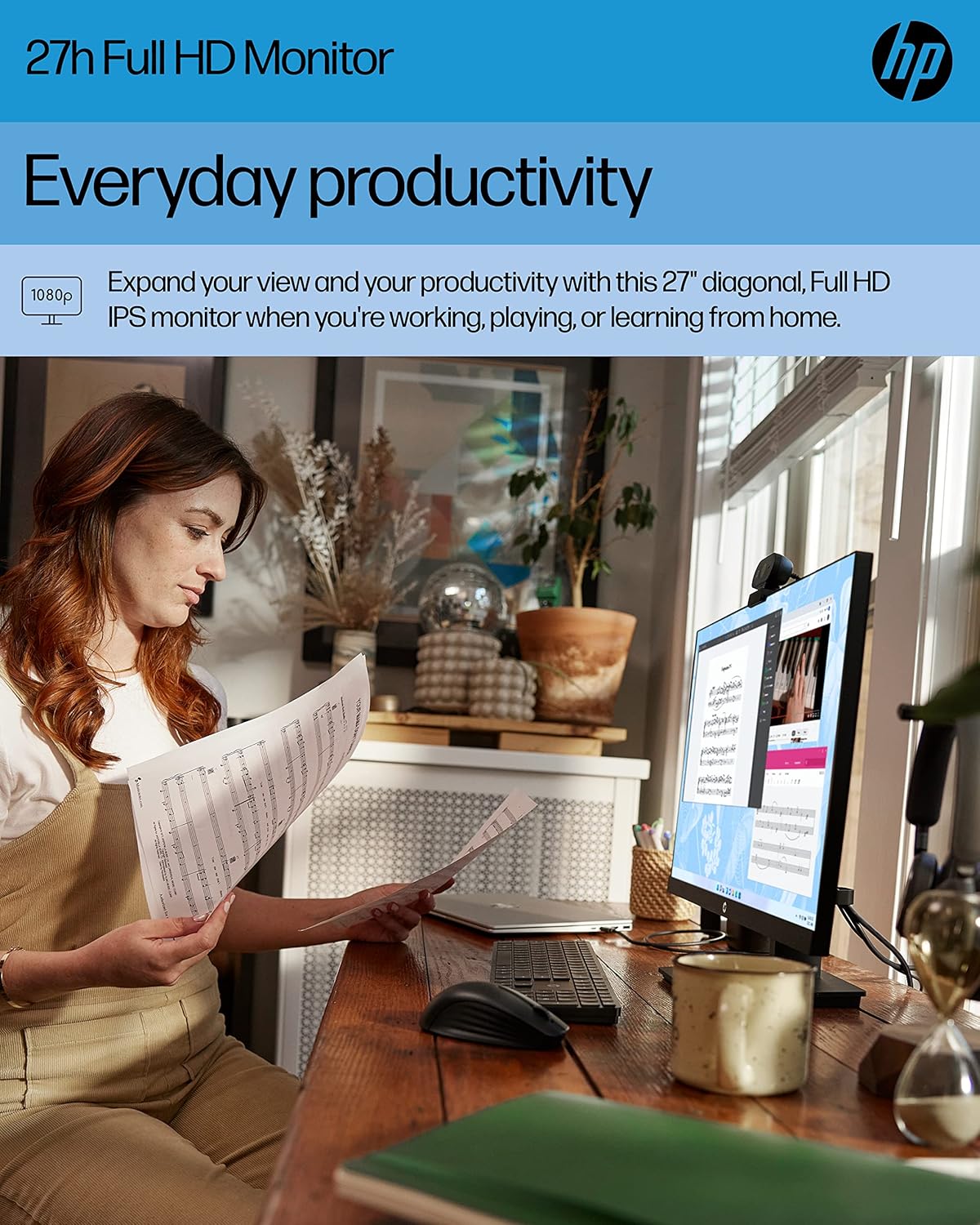 The HP 27h Full HD Monitor is designed to bring your projects and content to life with its vibrant display and boosted audio. Featuring a smooth screen, 3-sided micro-edge bezel, and adjustable height/tilt, this monitor is perfect for hybrid workers seeking comfort and clarity. **Specifications:** * **Screen Size:** 27 Inches * **Resolution:** 1920x1080 (Full HD) * **Panel Type:** IPS * **Refresh Rate:** 75Hz * **Bezel:** 3-Sided Micro-Edge * **Adjustability:** 100mm Height/Tilt Adjust * **Speakers:** Built-in Dual Speakers * **Ports:** HDMI, DisplayPort, VGA * **Color:** Black * **Design:** Sustainable (85% Recycled Plastics, 100% Recyclable Packaging)We partner with Amazon and other retailers to provide accurate product information and convenient access to purchase options. As an Amazon Associate we earn from qualifying purchases.