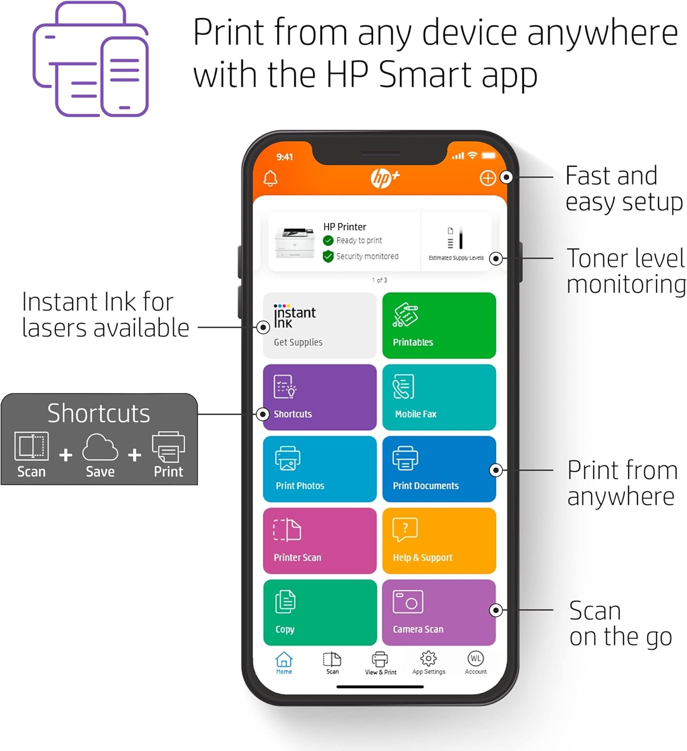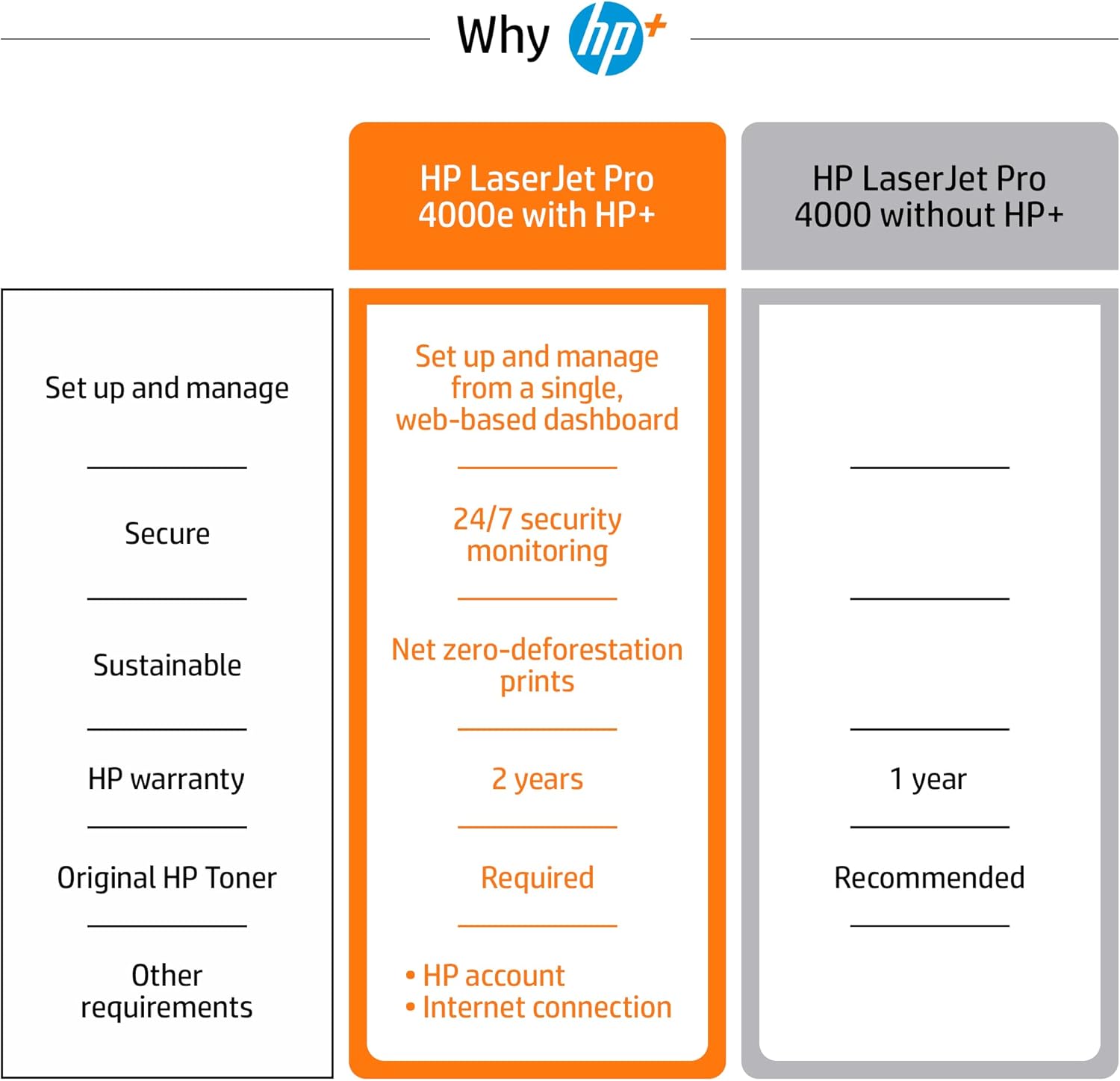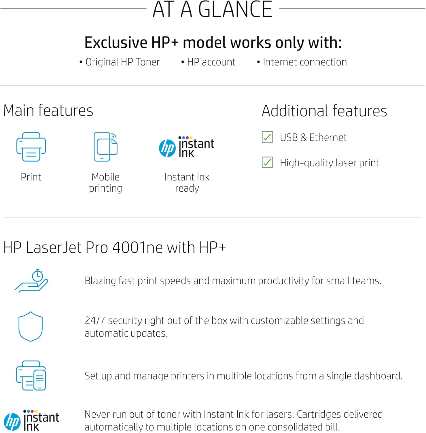 This renewed HP LaserJet Pro 4001ne offers reliable and efficient black & white printing for small teams. Equipped with HP+ smart office features, this printer provides seamless management and connectivity. Enjoy fast print speeds, automatic paper jam recovery, and the ability to manage printers from anywhere.