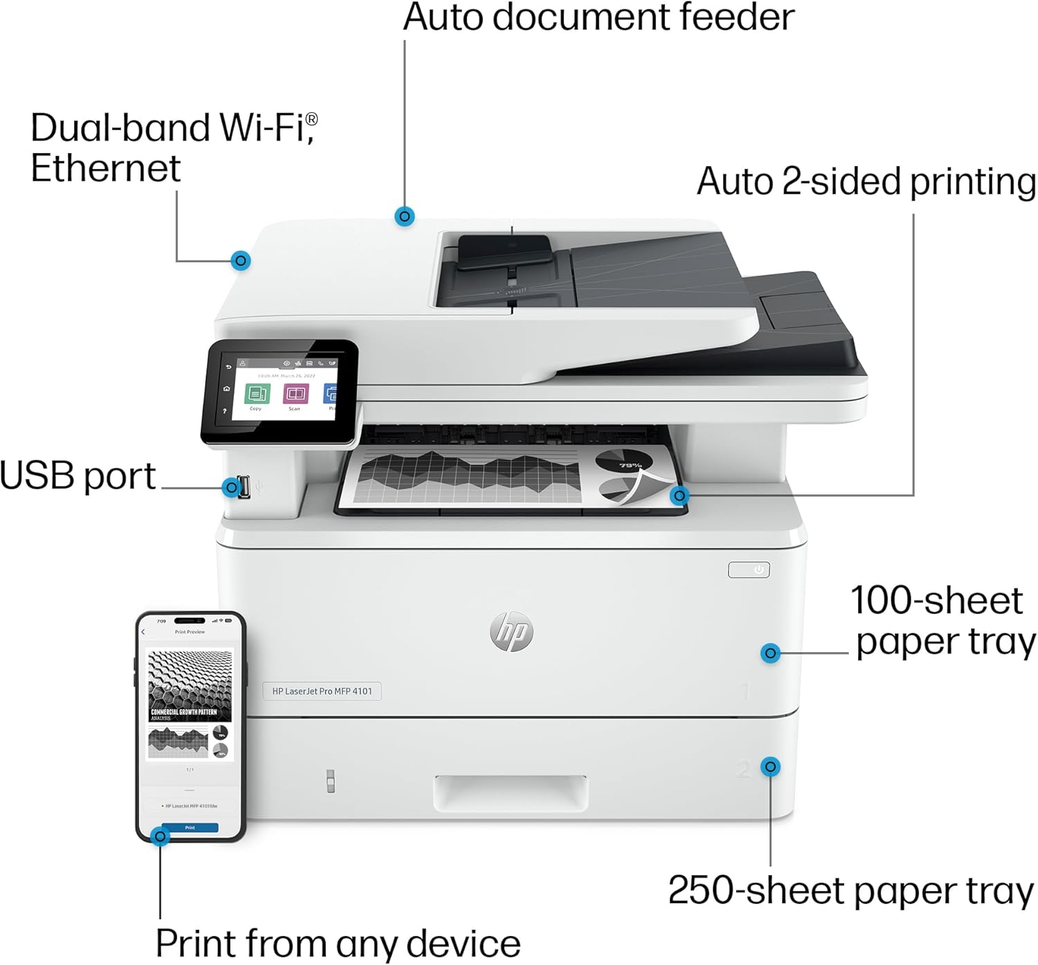 Introducing the HP LaserJet Pro MFP 4101fdw, a powerful monochrome all-in-one laser printer designed for small to medium-sized businesses. This printer delivers fast printing speeds, high-volume scanning, and intuitive management tools. It features automatic two-sided printing, an auto document feeder, and seamless connectivity options. Built with advanced security features, the LaserJet Pro ensures your sensitive documents remain protected.